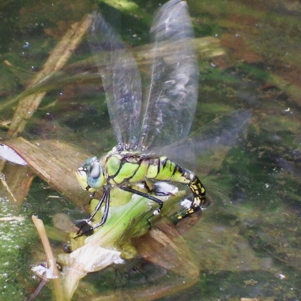 うす暗い水辺を飛ぶ美しいヤンマ