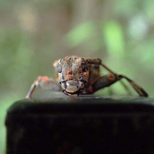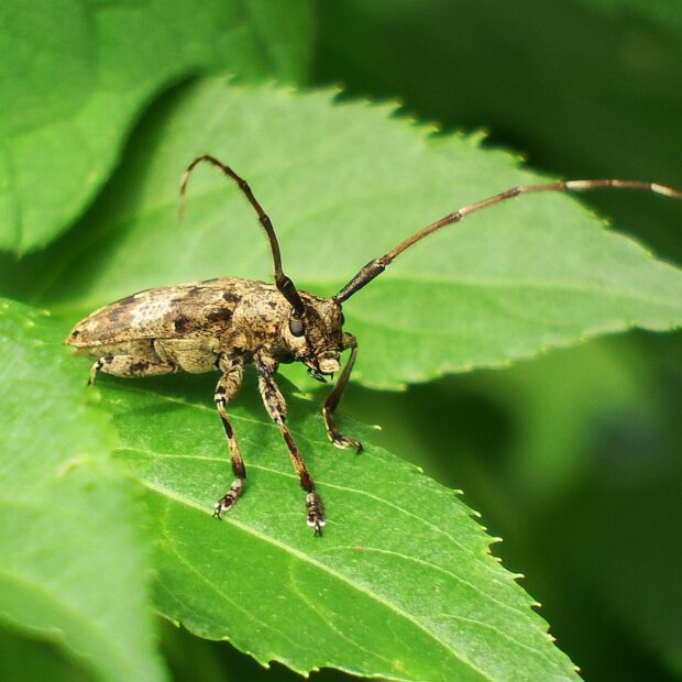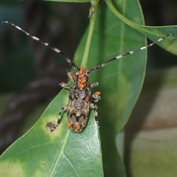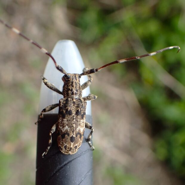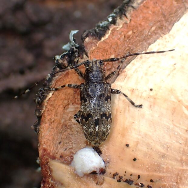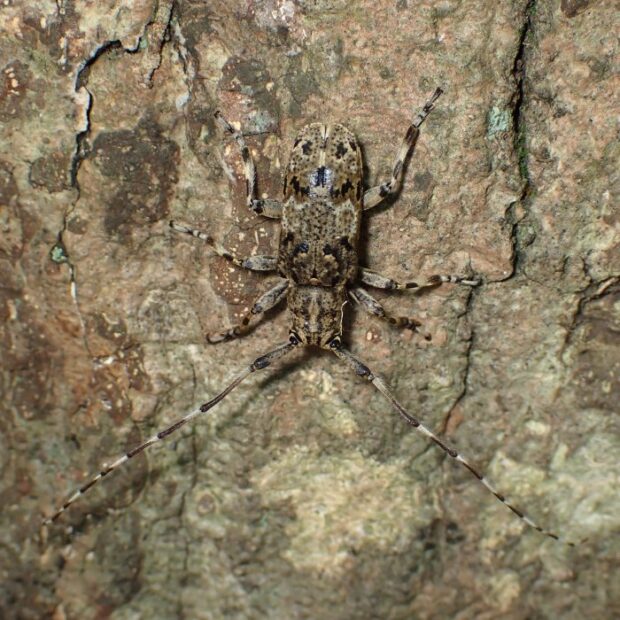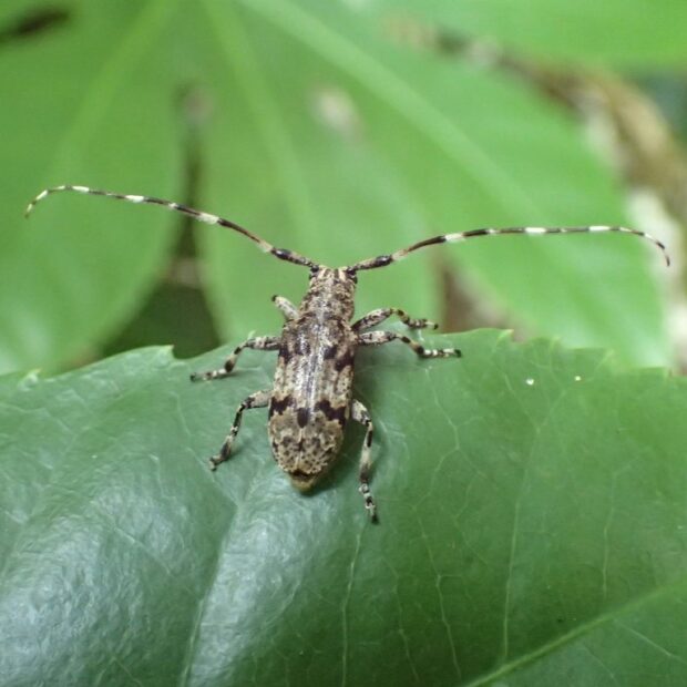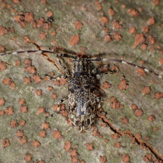 黒い紋と白い波型模様がある、 まだら模様のカミキリムシ。 平地~丘陵地、 雑木林の枯れ木や伐採木で、 普通に見られます。 カタシロゴマフカミキリに似ていますが、 本種は体型がやや細長く、 上翅(じょうし)の紋に違いがあります。 幼虫は枯れ木、 伐採木、 シイタケのほだ木などを食べます。