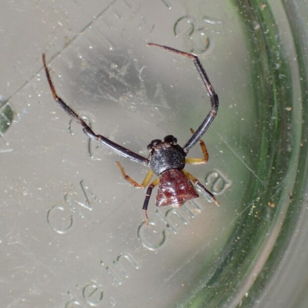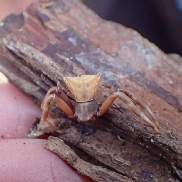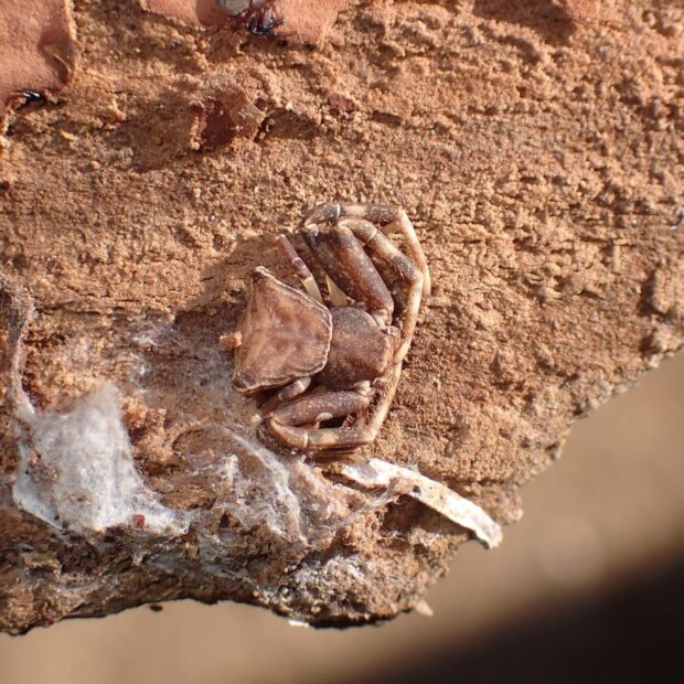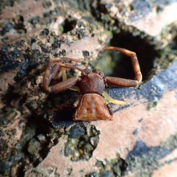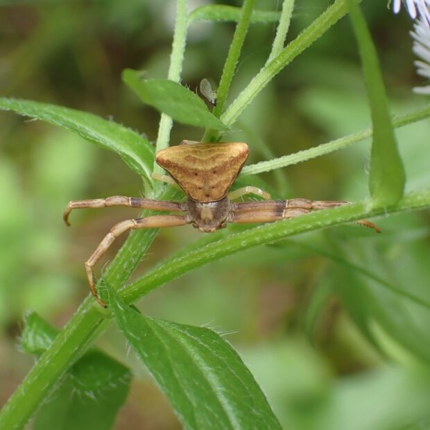 全体が茶色で、 腹部が台形状のカニグモの仲間。 花などで、 長い第1・2脚を広げて獲物を待ち伏せし、 大きな獲物を捕えます。 カニグモの仲間であることから、 ガザミグモと名づけられました。