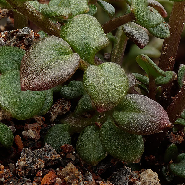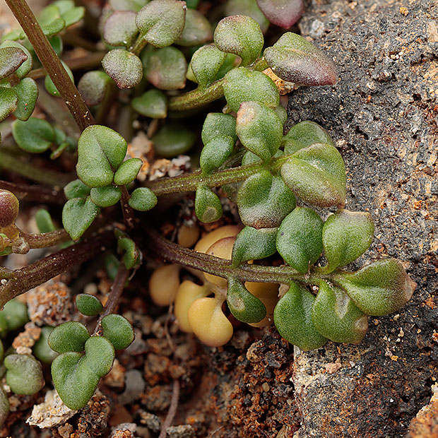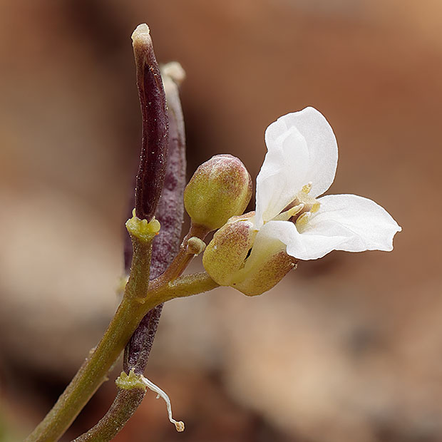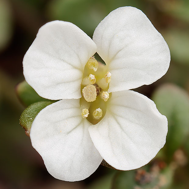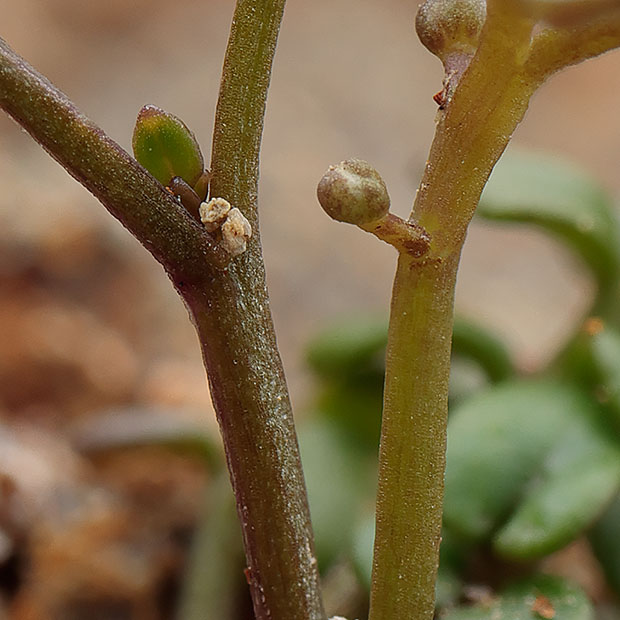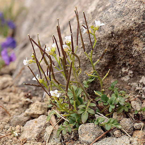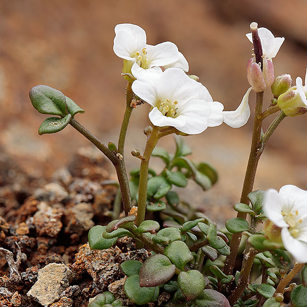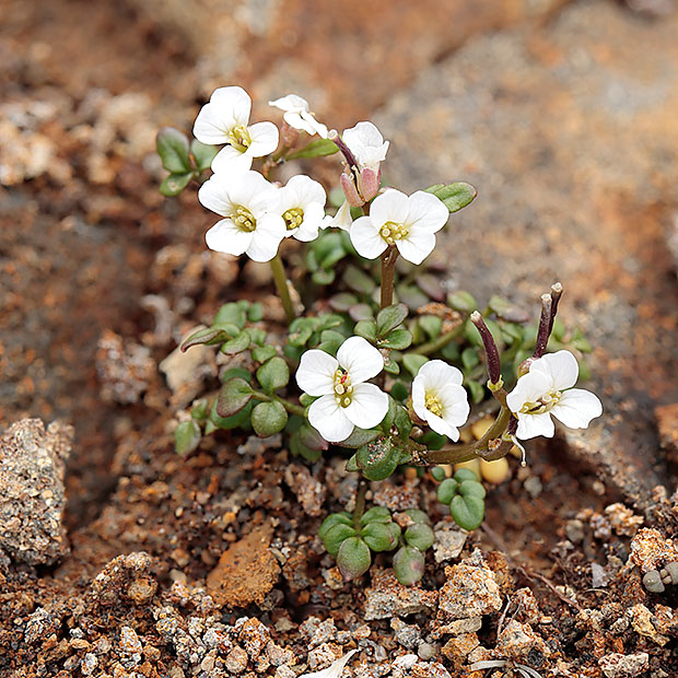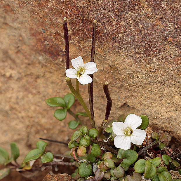 ナズナのように4枚の白い花びらをもつ花を咲かせます。 小さな茎を数本立てて株状になり、 茎や葉に毛がありません。