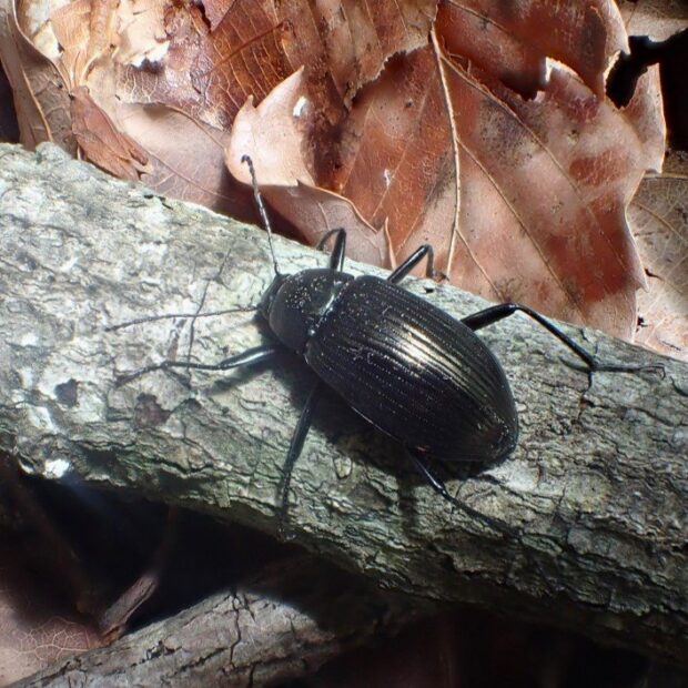 倒木や枯木の幹を歩き回るゴミムシダマシの仲間。 雑木林~山地で普通に見られます。 あしが長く、 全身黒色で、 銅色や藍色がかった光沢があります。 本州中部以北では青みを帯びた黒色で、 中部以西では銅色をしたものが多いです。 幼虫は朽ち木の中で育ち、 朽ち木の分解の役割を担っています。