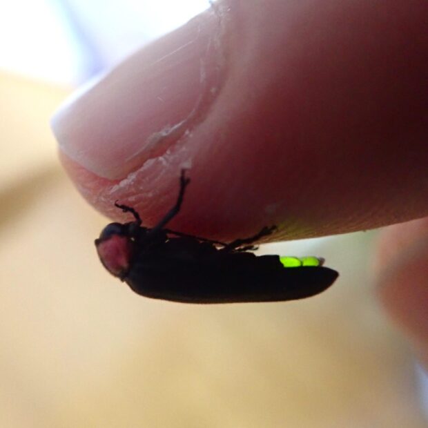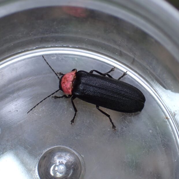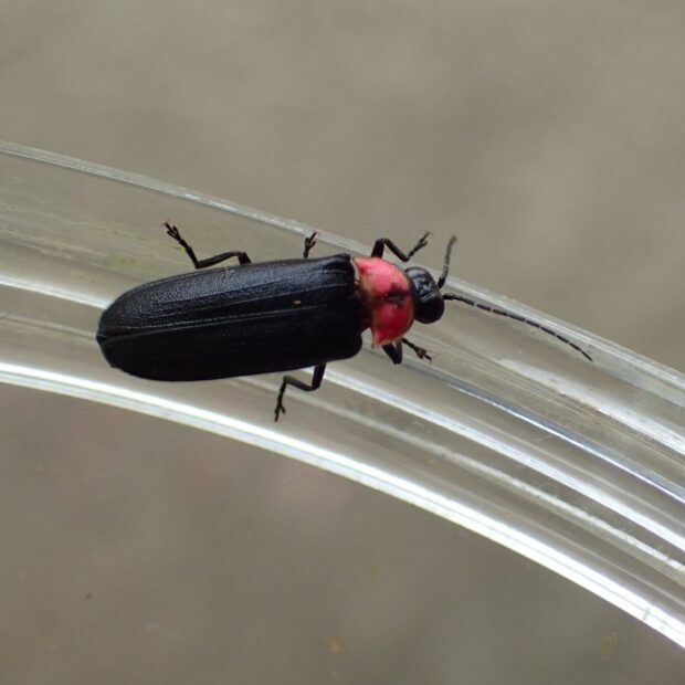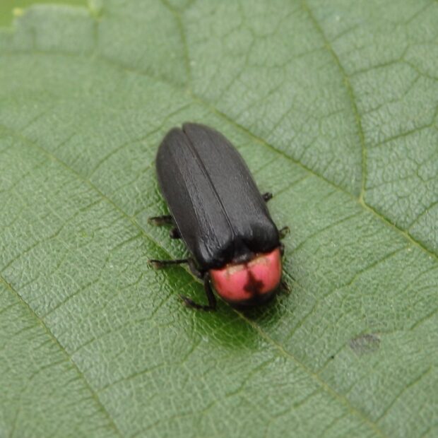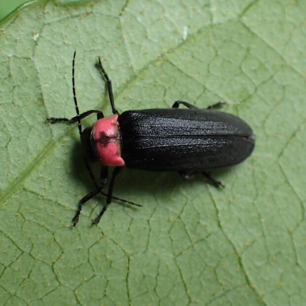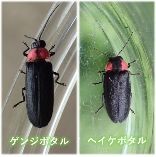 ヘイケボタルは、 小さく、 胸の黒い模様が太い筋になっています。