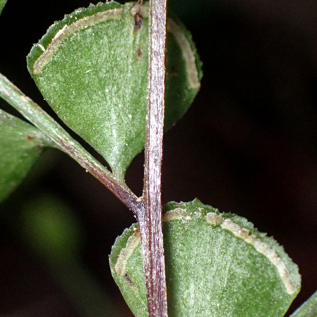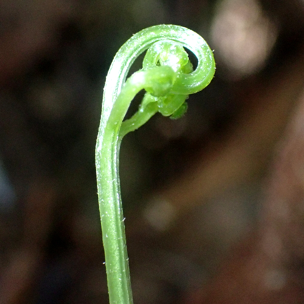 南国の林内に多い小さめのシダ。 近縁のエダウチホングウシダに似ていますが、 扇形の小羽片は先がふつう切れ込まず、 裏のフチに沿って長い胞子のう群をつけます。 名前はエダウチホングウシダに似ているけど新しい種であったことに由来します。