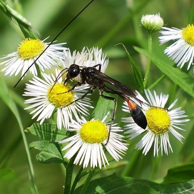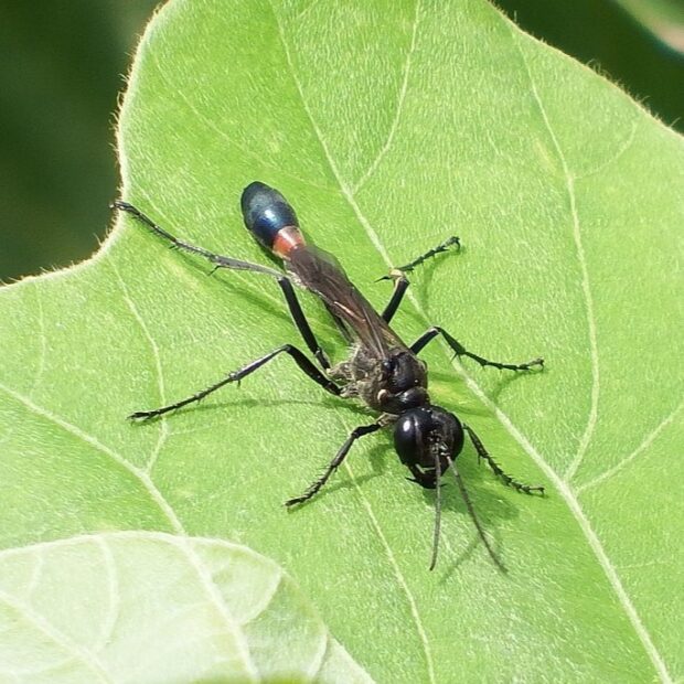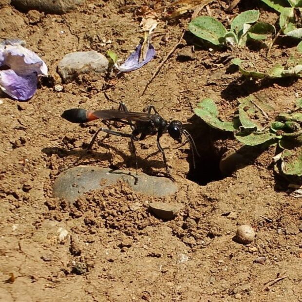 アナバチの仲間。 地面に穴を掘った巣に、 麻酔をしたガの幼虫(イモムシ)を入れて、 幼虫のエサにします。 名前は、 はねをすり合わし「ジガジガ・・・」と音を立てることに由来しています。