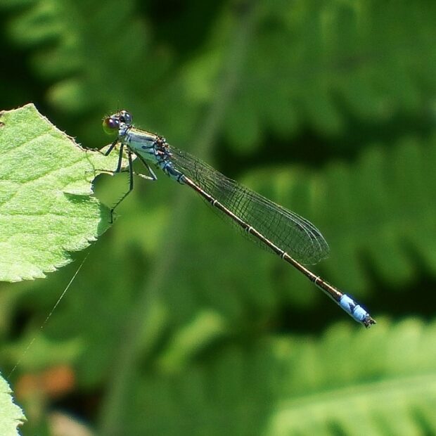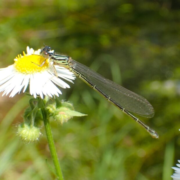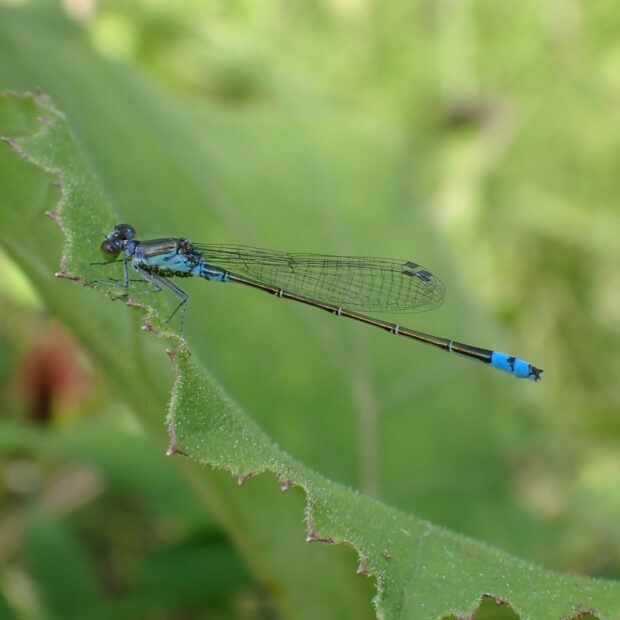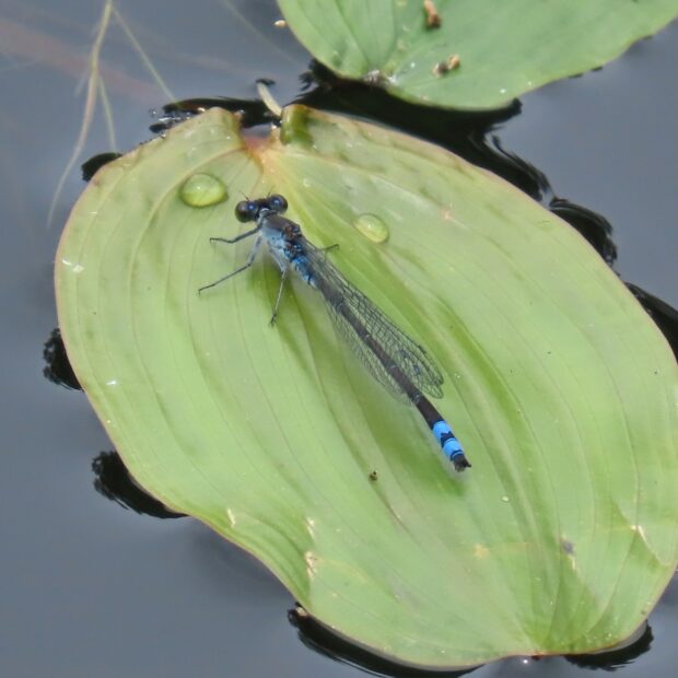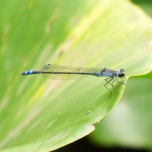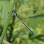林に囲まれた水草が多い池などで、 普通に見られる小さなイトトンボ。 オスは成熟すると青白い粉を吹きます。 メスは、 緑色と青色の2つのタイプがいます。