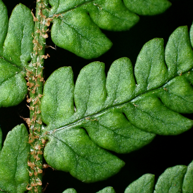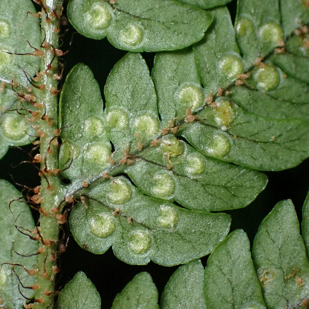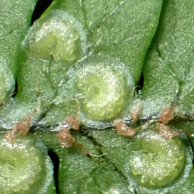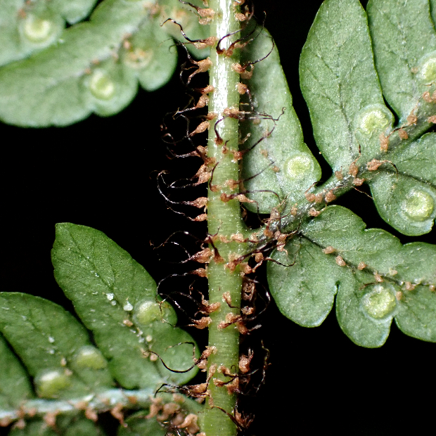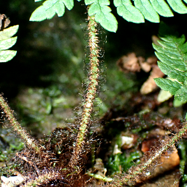 深い山の岩場に生えるシダ。 ヤマイタチシダによく似ていますが、 葉はより細長い感じで、 葉軸の鱗片が反り返るように大きく開いてモジャモジャしています。