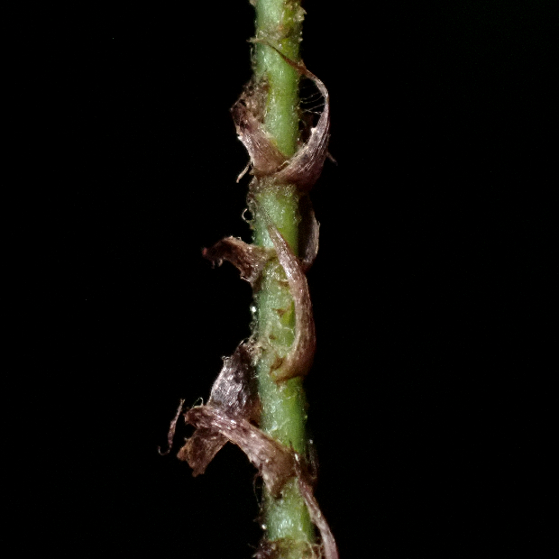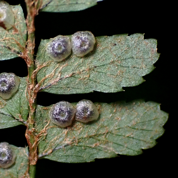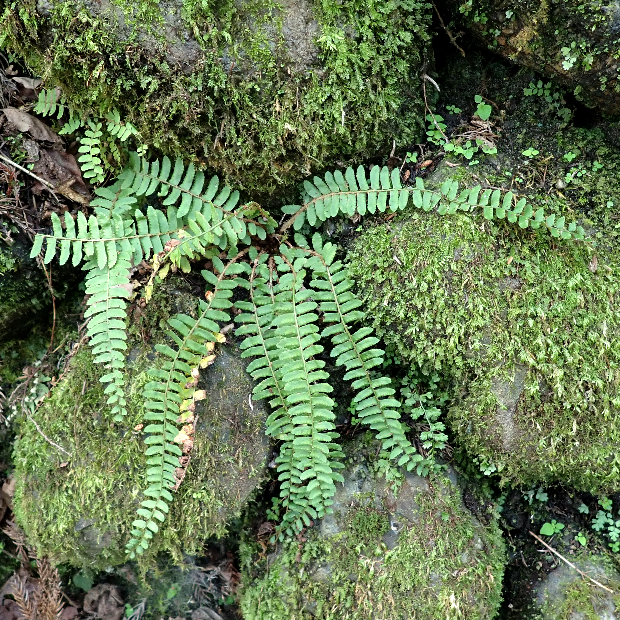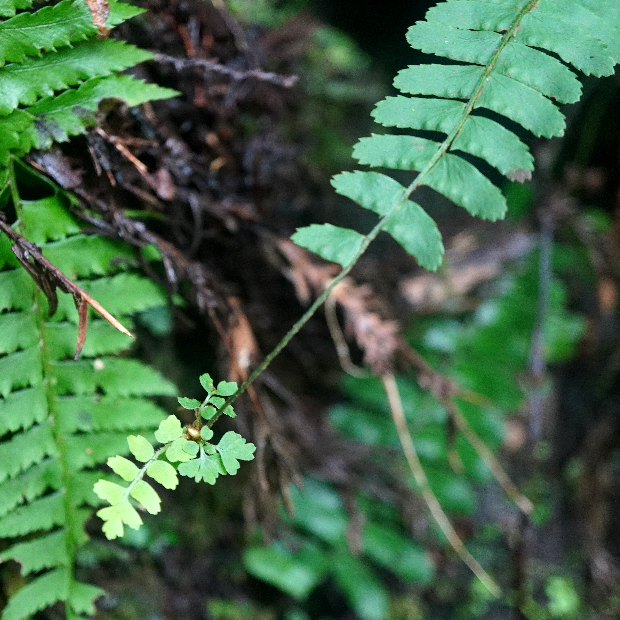 岩にへばりつくように生えていることが多い小さめのシダです。 胞子だけでなく、 葉先に無性芽(むせいが)をつけることでも数を増やします。 見た目はあまり似ていませんが、 イノデの仲間です。