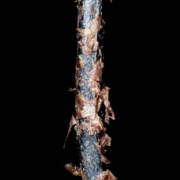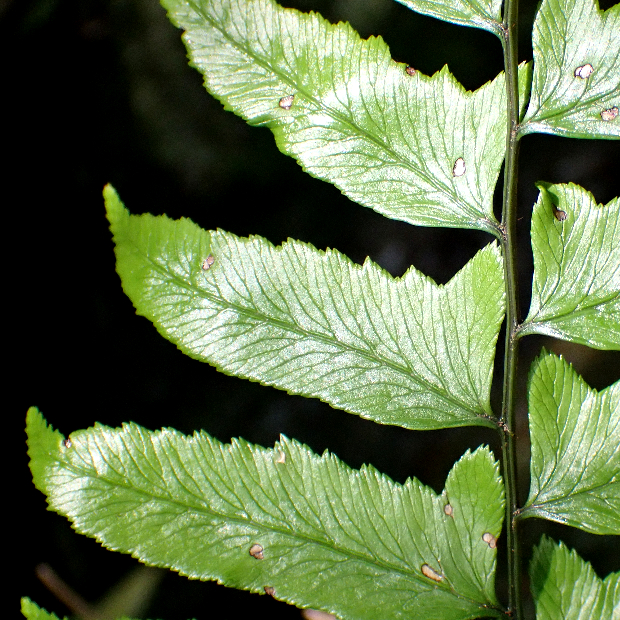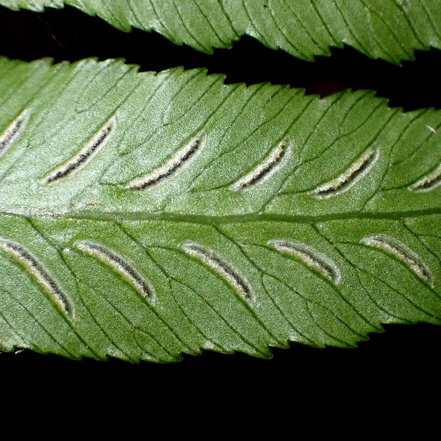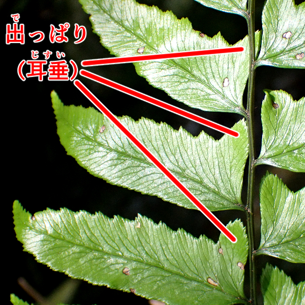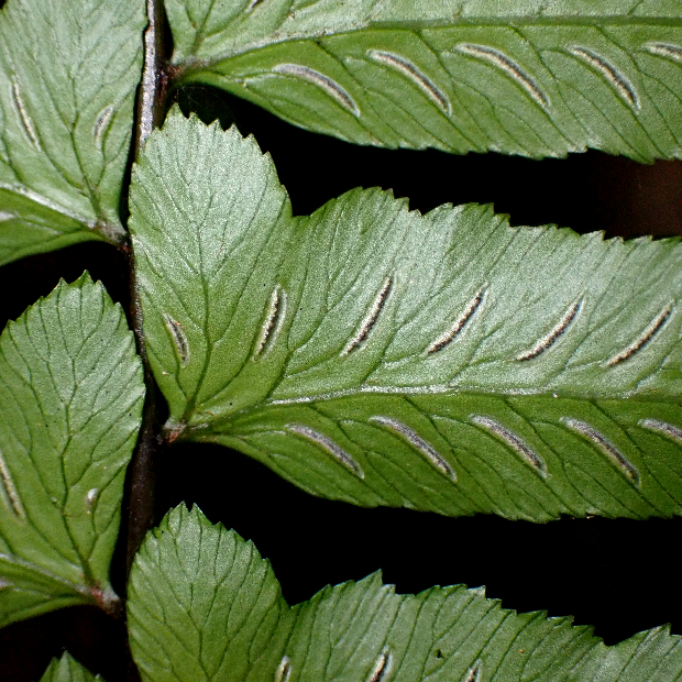暖かい地域に多いシダ。 葉は硬そうな質感で、 表面の葉脈が目立ち、 羽片のフチに粗いギザギザがある感じがノコギリっぽく見えます。 葉裏には三日月形のカーブした胞子のう群が連なってつき、 黒く硬めな葉柄には茶色っぽい鱗片がつきます。