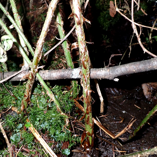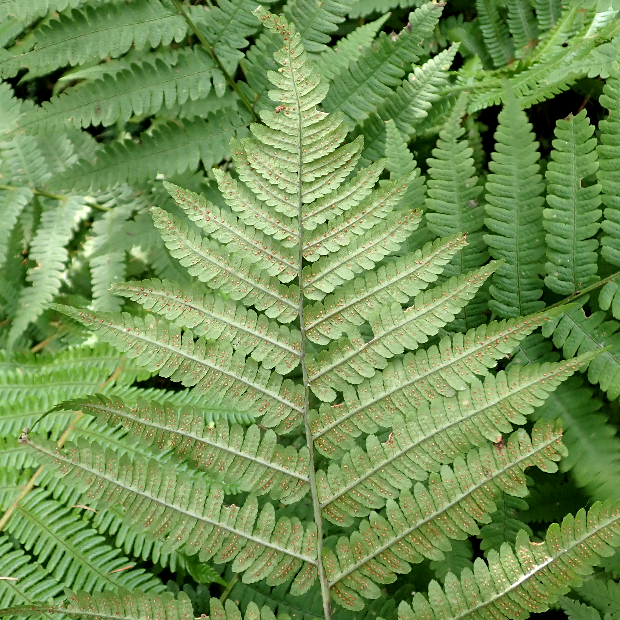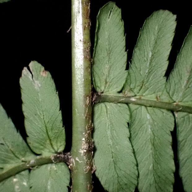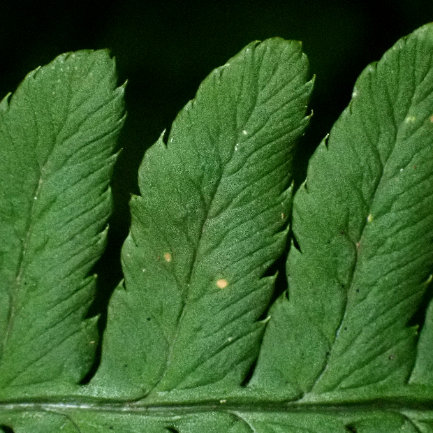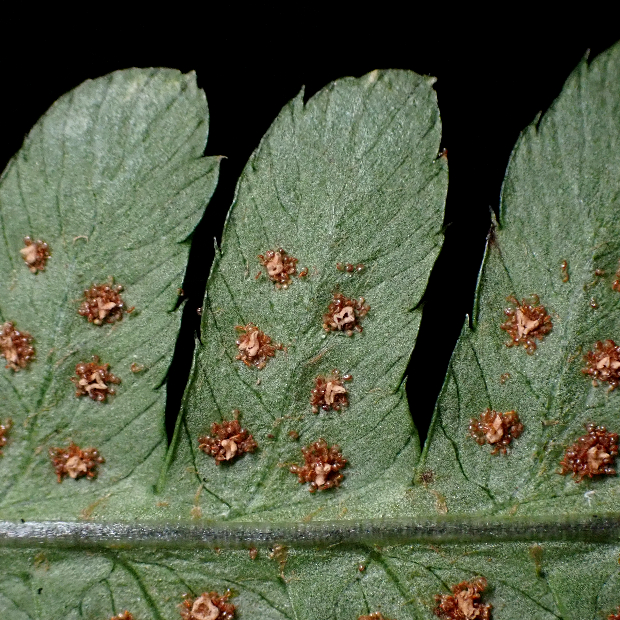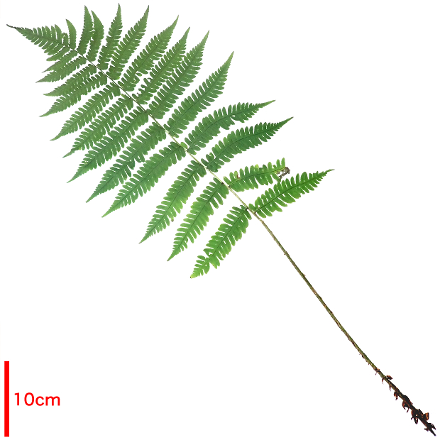 夏でも涼しいような深山の林内に多いシダ。 葉はツヤがなくて長方形のような形をしています。 葉裏の上半分には丸い胞子のう群をつけ、 葉柄には幅広くてツヤのある茶色の鱗片を多数つけます。 ベニシダとは同属ですが、 これらの特徴から外見はあまり似ていません。