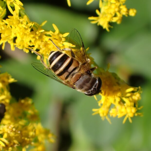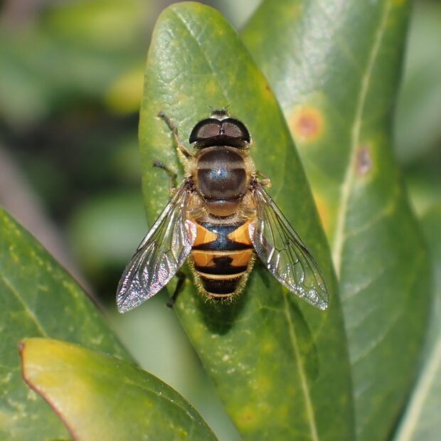 花によくやって来るハナアブの仲間。 胸に黒い横帯があるのが特徴。 ハナアブの仲間の幼虫は長い呼吸菅を持つことから「オナガウジ」と呼ばれ、 汚れた水の中で育ちます。