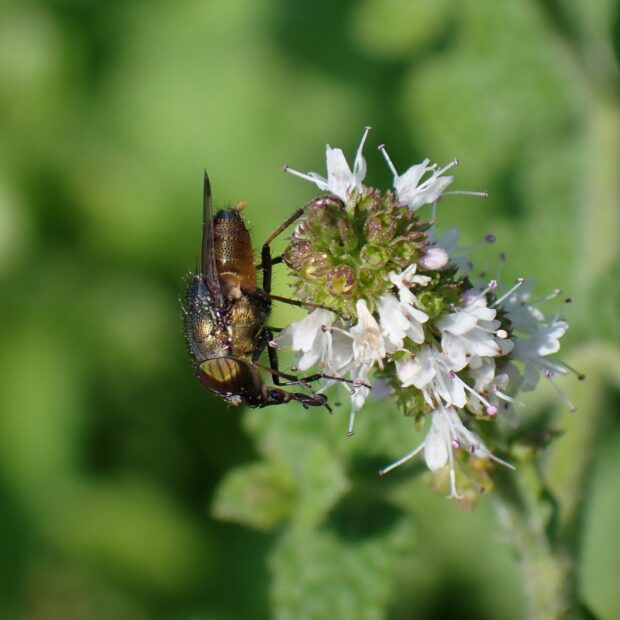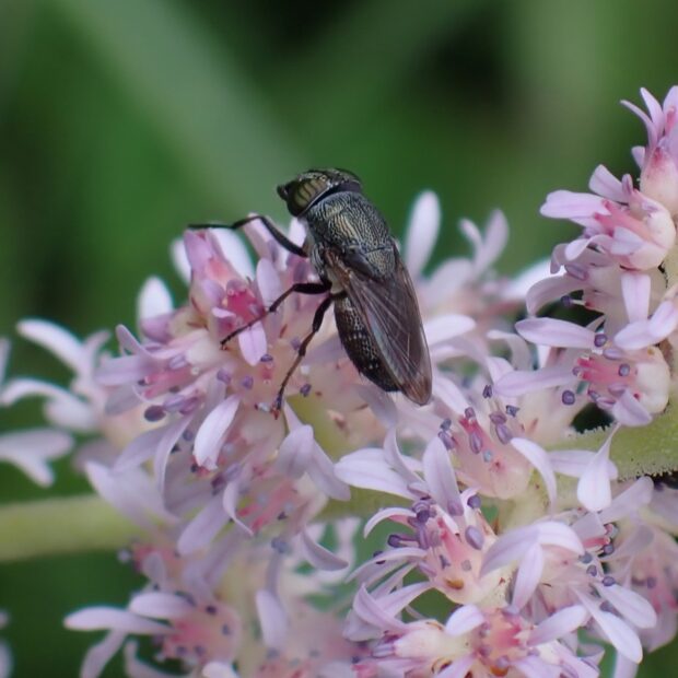 花によくやって来るクロバエ科の仲間。 冬でも暖かい日には姿を見せ、 ほぼ1年中、 普通に見られます。 胸は深緑色で毛が密生し、 はねの先端は黒くなっています。 口は折りたたみ式で長く伸ばすことができます。