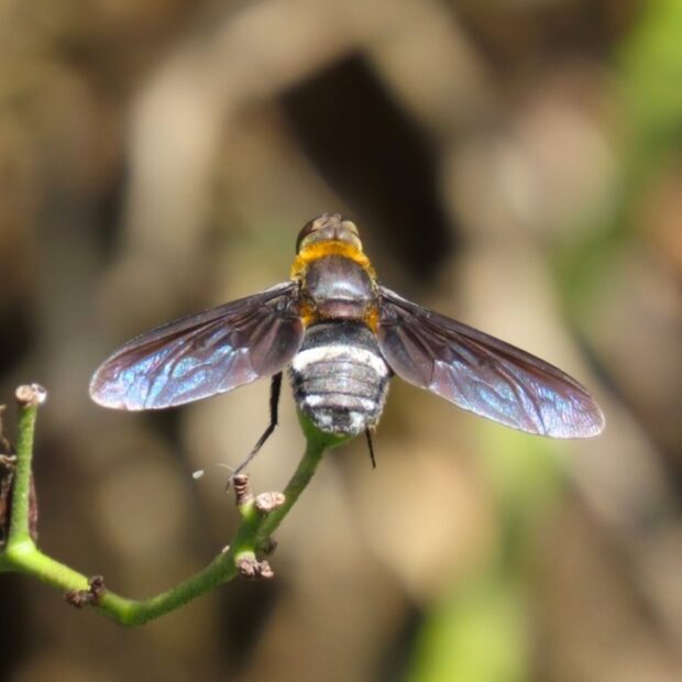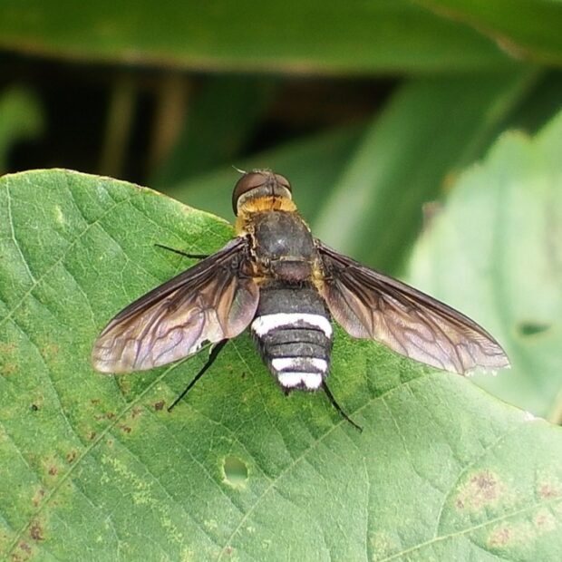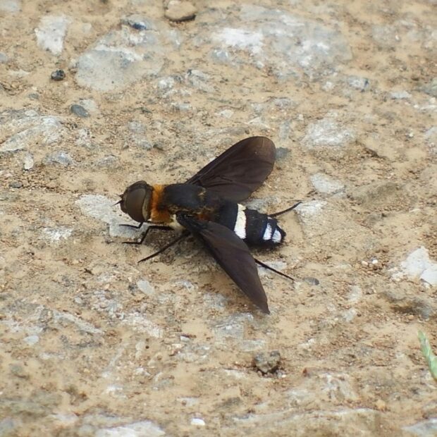 はねが黒く、 腹部に白い帯があるツリアブの仲間。 夏から秋にかけて見られ、 ツチバチ類に寄生します。 不明種を含む類似種が複数いるとのこと、 識別には注意が必要。