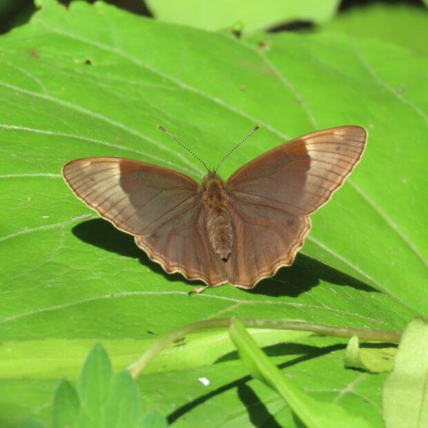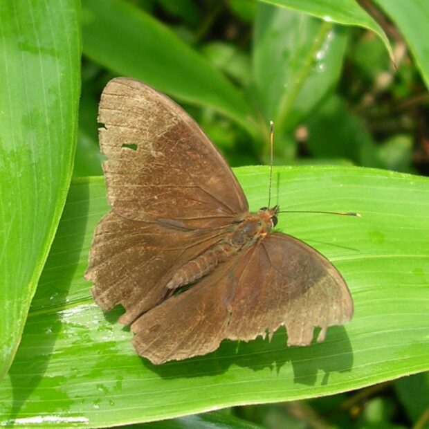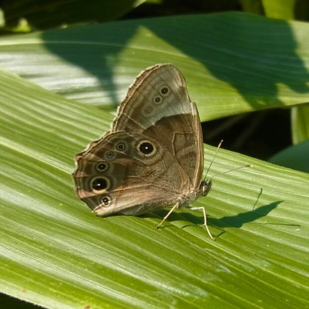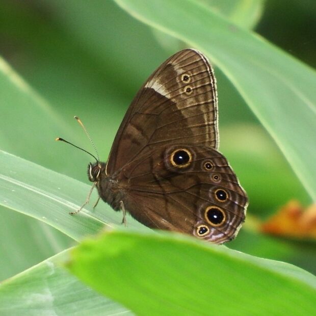 薄暗い林で見られる目玉模様の黒っぽいチョウ。 オスははねが黒褐色で、 メスは茶褐色ではねに丸みがあります。