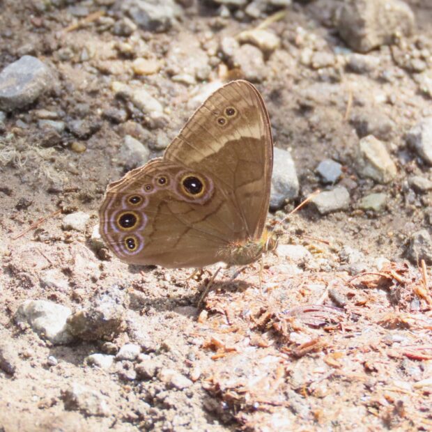 クロヒカゲは、 林や山の薄暗い所で見られます。 はねの色が濃く、 後ばね裏の線がくの字に曲がっています。