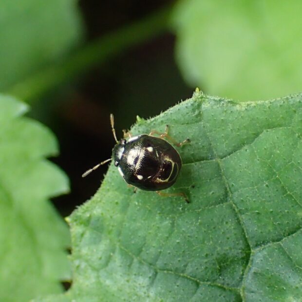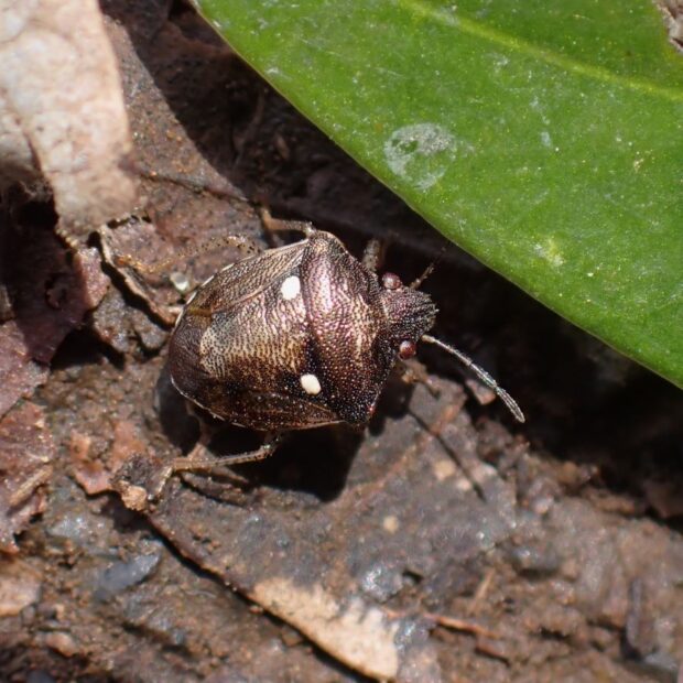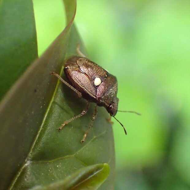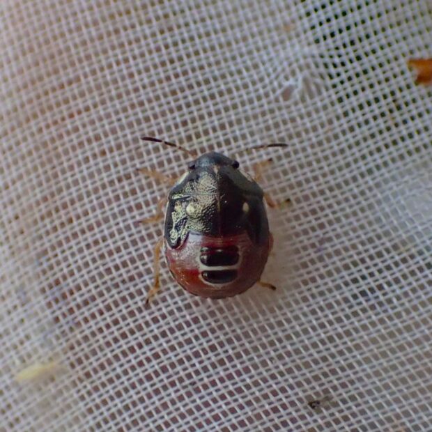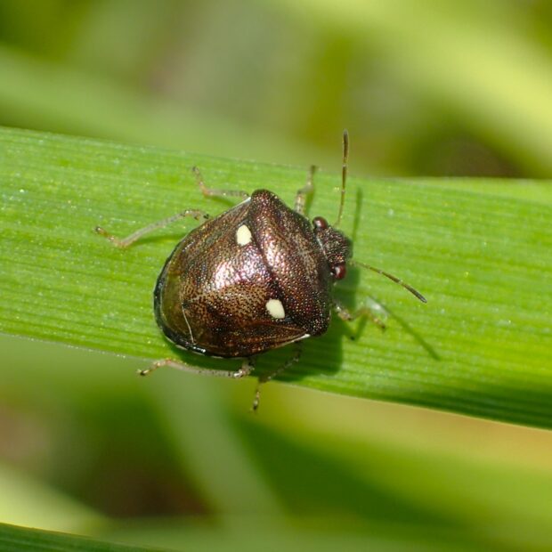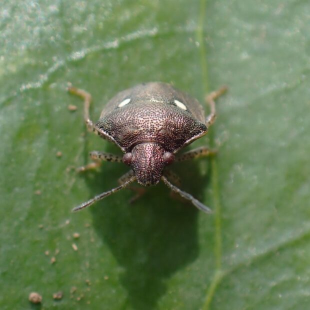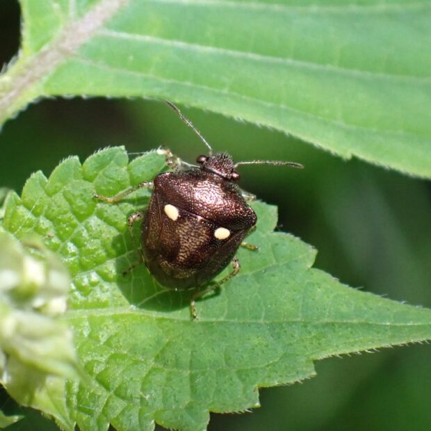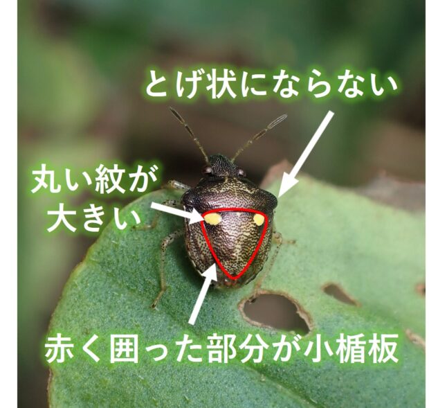 別名ツヤマルシラホシカメムシ。 草地で普通に見られる丸い体型のカメムシ。 小楯板基部にある黄白色の紋が大きく、 胸部が両側にあまり張り出さないことが特徴です。 シラホシカメムシの仲間は似ているので注意が必要。