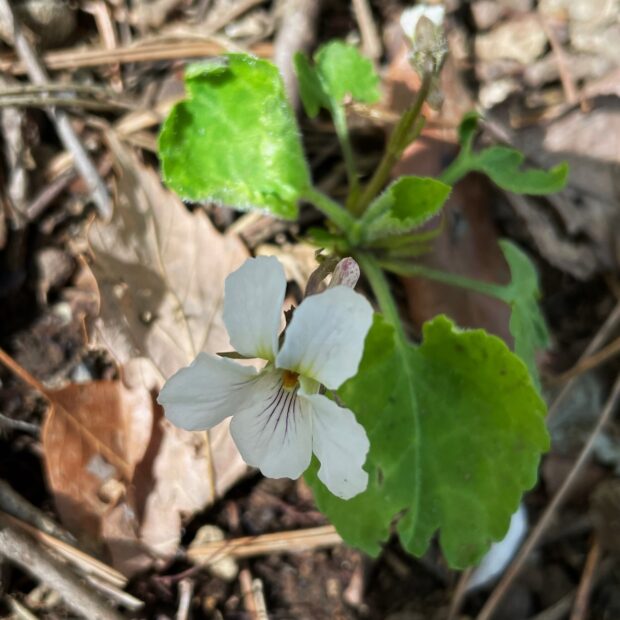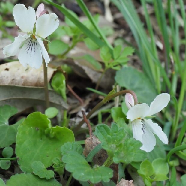 白い花で葉の丸いスミレです。 斜面の崩壊地などに最初に顔をだし、 他の草が生えだすと場所を移動するのか見なくなります。