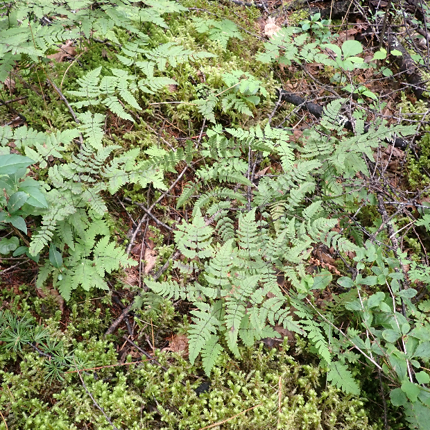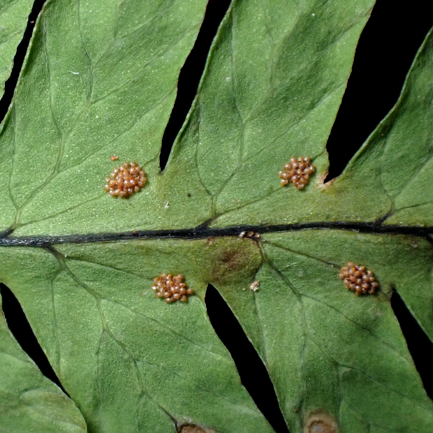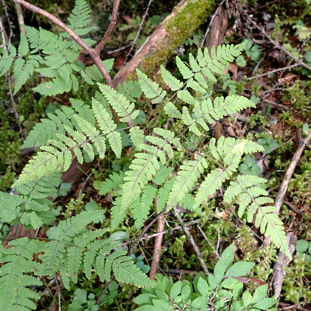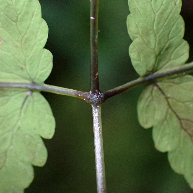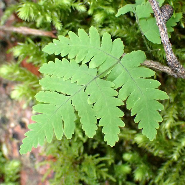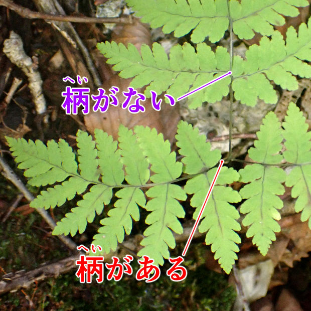 下から2番目の大きな切れ込み(羽片)にはっきりとした柄があるタイプ。 ウサギシダの変種(へんしゅ : 亜種ほどではないけど同種とするには違いがあるもの)とする考えもありますが、 最近はウサギシダに含められて区別しないことが多いです。