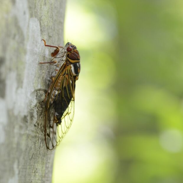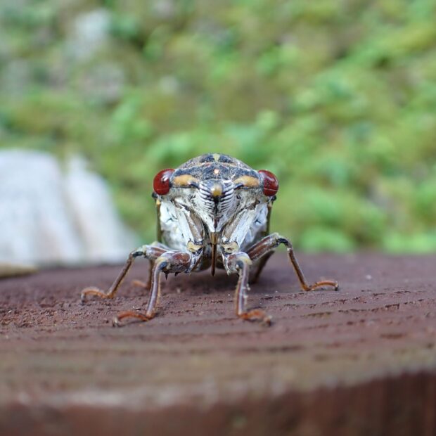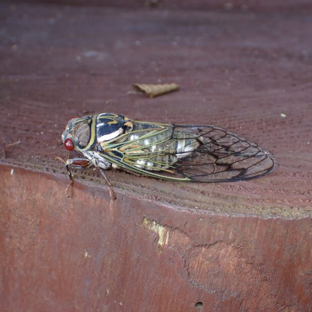 体は黒く、 黄色や赤褐色の紋がある山地性のセミ。 大型。 頭を下にして逆さにとまり、 「ギー」と鳴きます。 北海道では平地でも見られます。