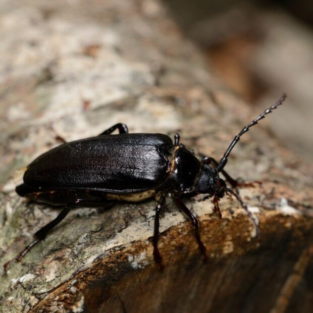 体は黒っぽく、 触角がのこぎりのようにギザギザになっているカミキリムシ。 のこぎり状の触角は、 メスは細く、 オスはより太くなります。 平地~山地にかけて生息し、 いろいろな樹木で普通に見られます。 夜は明かりにやって来ます。