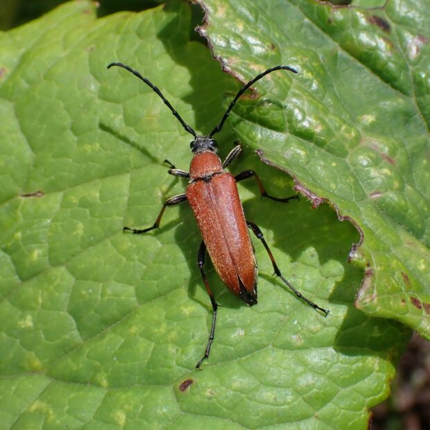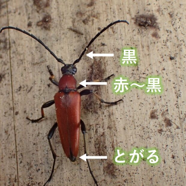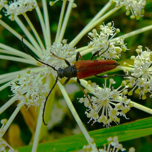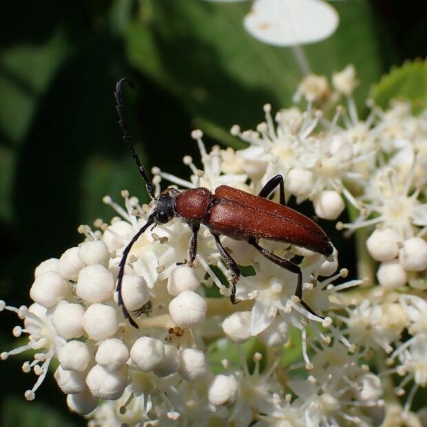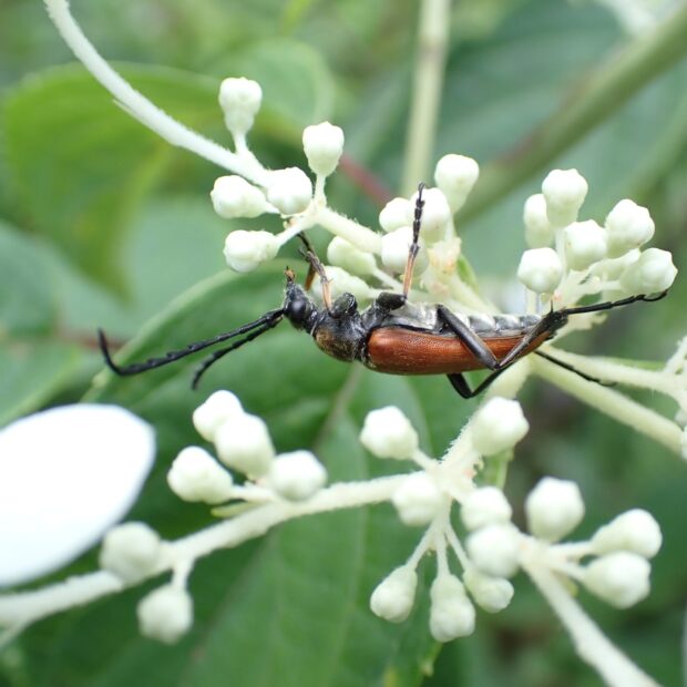 普通に見られるハナカミキリの仲間。 山で見られることが多いですが、 平地でも見られ、 広く生息しています。 真夏に活発に活動し、 ノリウツギなど白い花によくやって来ます。