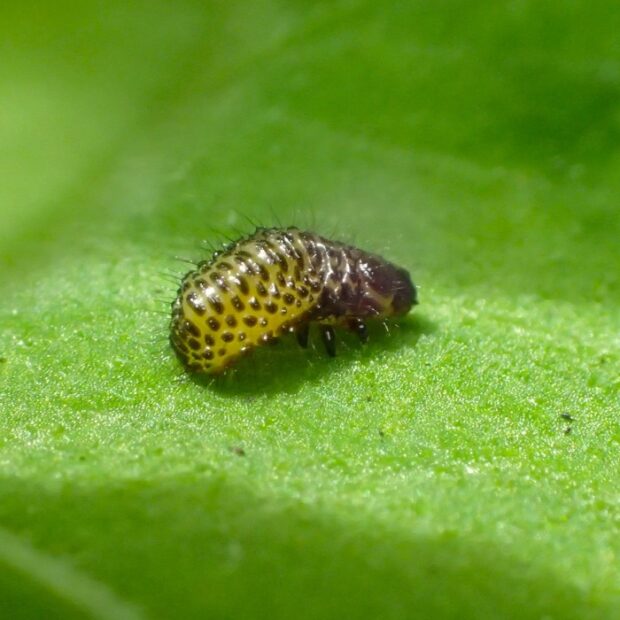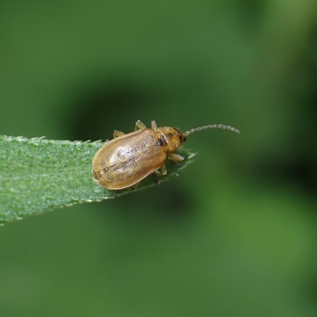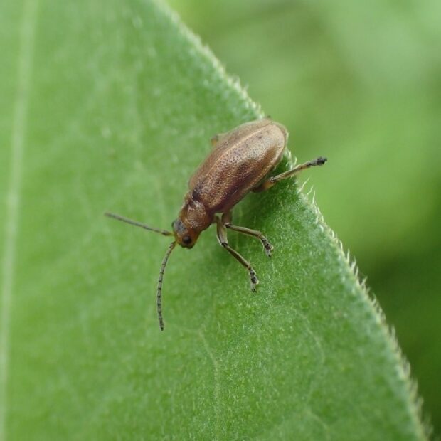 タデ科植物につく小さなハムシ。 オランダイチゴの葉も食べます。 前胸の真ん中がなめらかで毛がないことが特徴です。