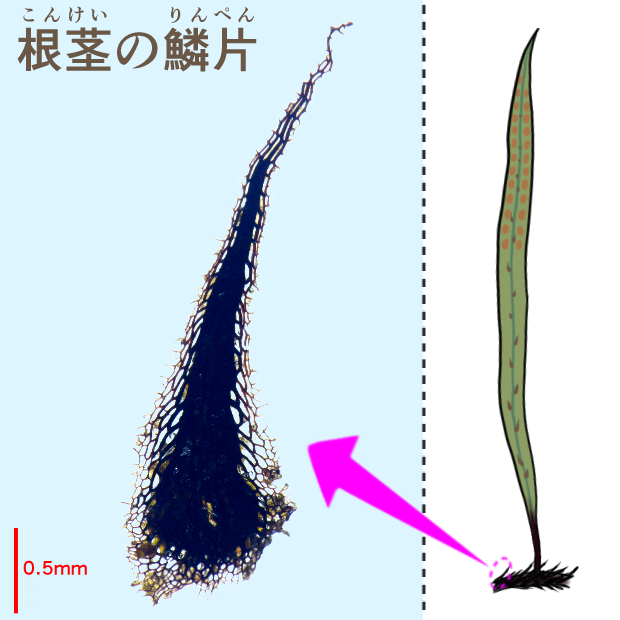 山地に生え、 岩などから葉を垂らすノキシノブの仲間のシダ。 この仲間の中では、 葉柄がふつう黒っぽくて長く、 根茎を長めにはうことがわかりやすい違いです。 珍しいシダというわけではなく、 各地でよく見られます。