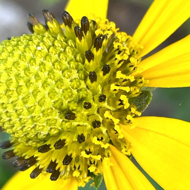 筒状の花の外周部、 雌しべが完全に開いている。 その左の花は、 筒からめしべが伸びだそうとしている。