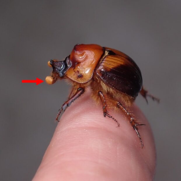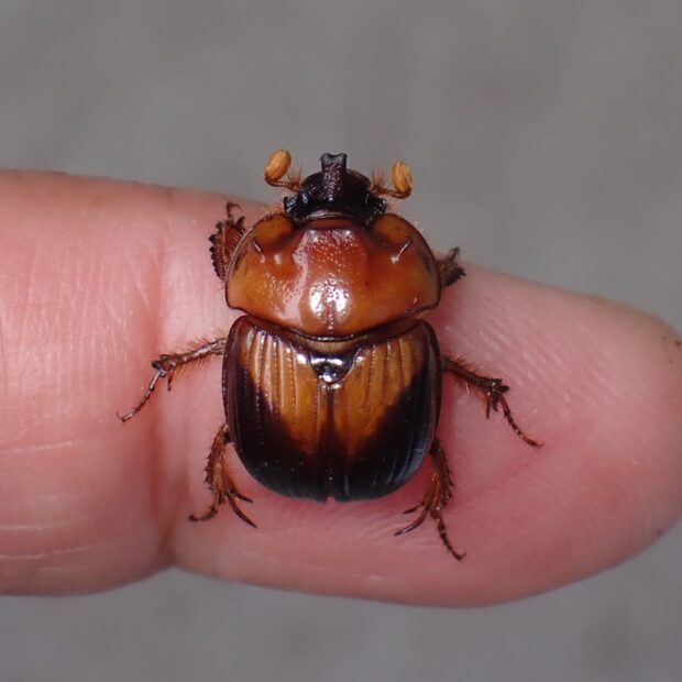 草地や芝生など開けた環境で見られるセンチコガネ。 体は丸っこく、 オレンジ色と黒色をしていますが、 上翅(じょうし)の色には変異があります。 フンではなく、 植物の根に共生している菌類を食べることが知られています。 明かりに飛来。