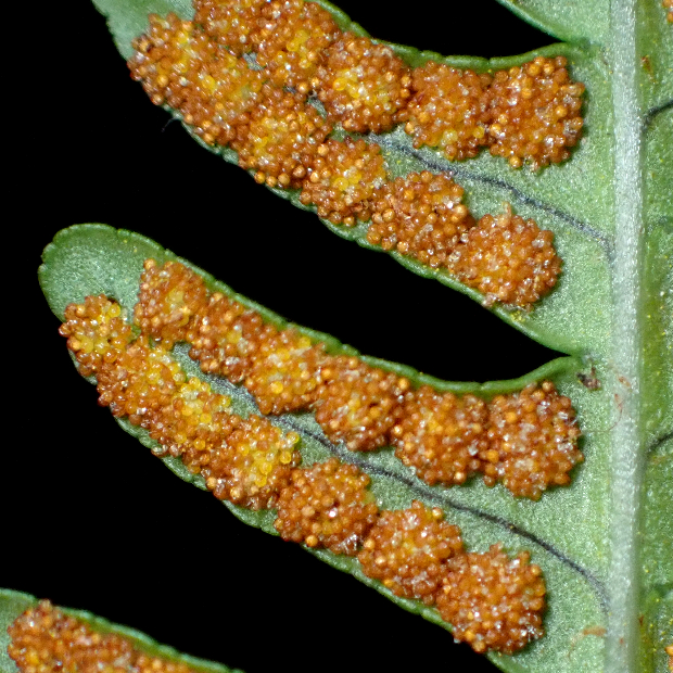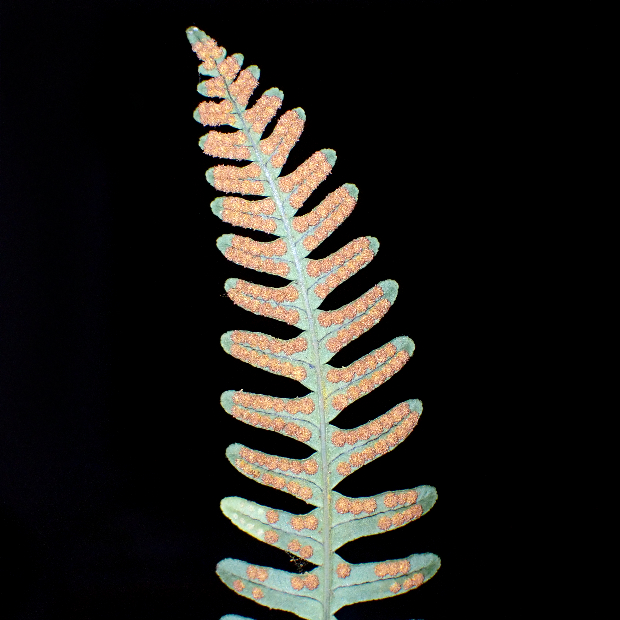 ●オオエゾデンダは①よりまれで、 ②胞子のう群をやや中心の脈寄りにつけ、 ③葉柄基部の鱗片は全体がうすい茶色です。