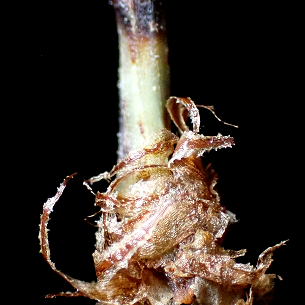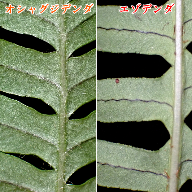 ●オシャグジデンダは①より普通で、 ②葉裏の脈上に毛が多く、 ③葉柄基部の鱗片は全体がうすい茶色で、 ④夏になると葉を枯らす冬緑性で、 ⑤乾燥標本にすると葉をくるっと曲げます。