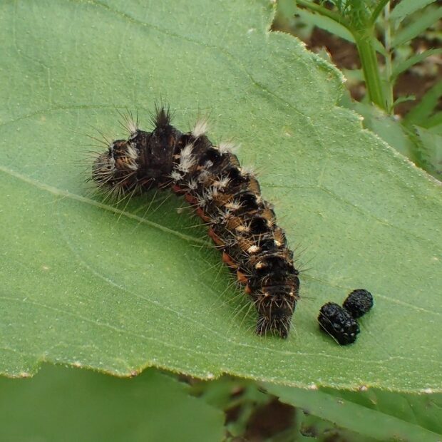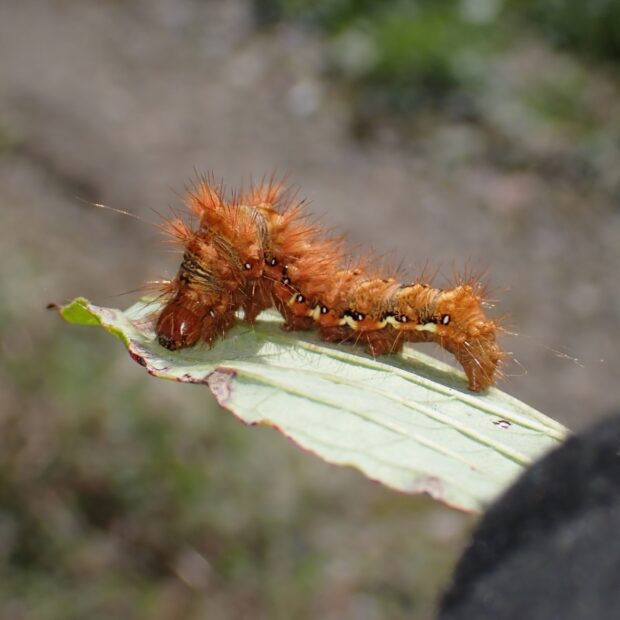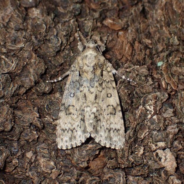 ヤガ科ケンモンヤガの仲間で、 ごく普通に見られます。 夜行性ですが、 昼間、 幹などでじっとしている姿を見ることができます。 幼虫は、 ケンモンヤガの仲間では珍しい毛虫型で、 黒色~褐色まで色の変異があります。