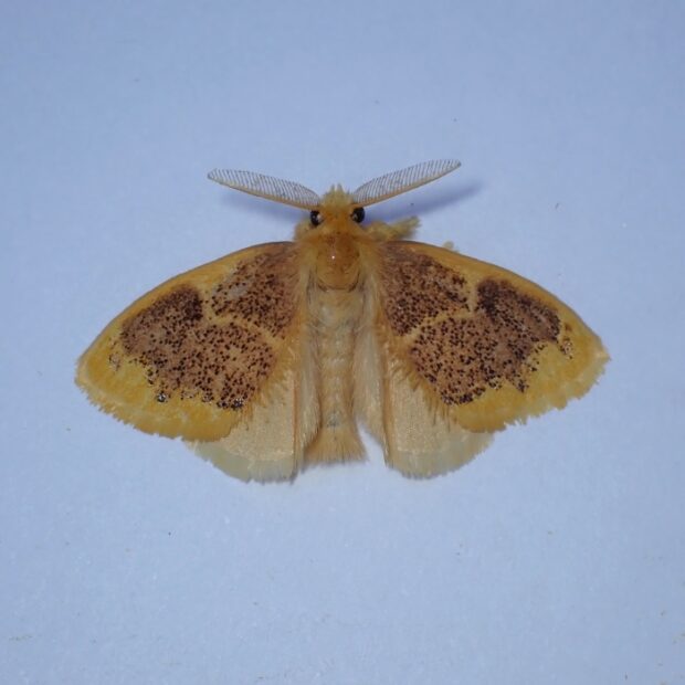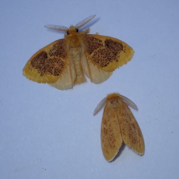 黄色いはねに黒い点々があるドクガの仲間。 はねの色や模様は変異があります。 公園や庭木などで普通に見られ、 明かりにやって来ます。 幼虫越冬。