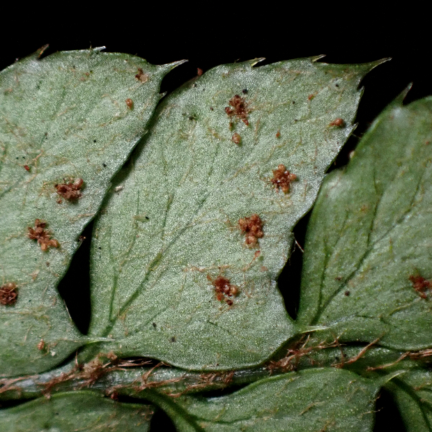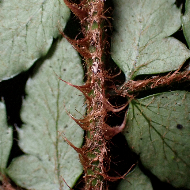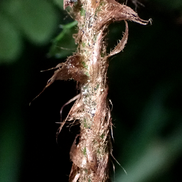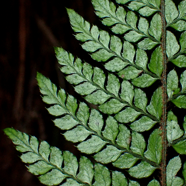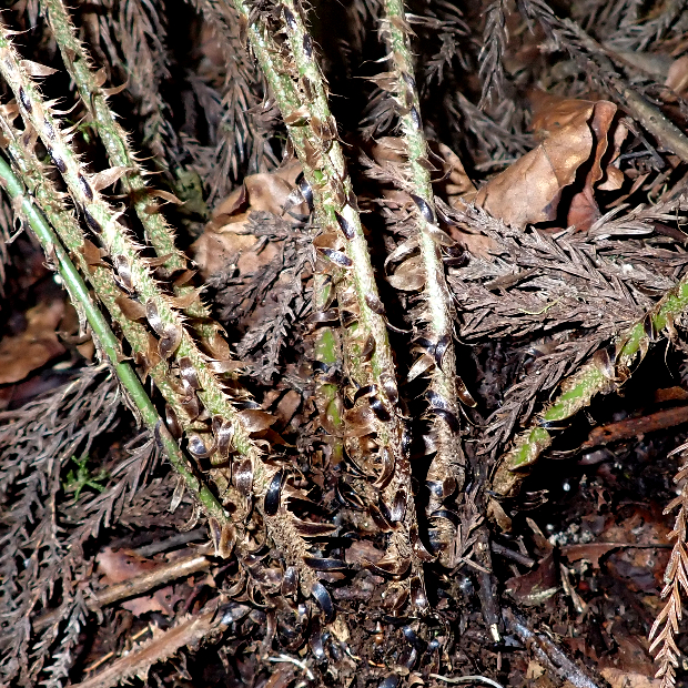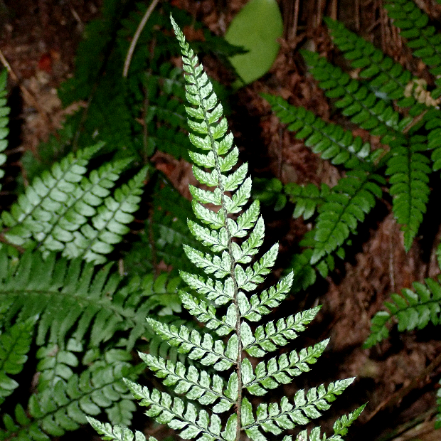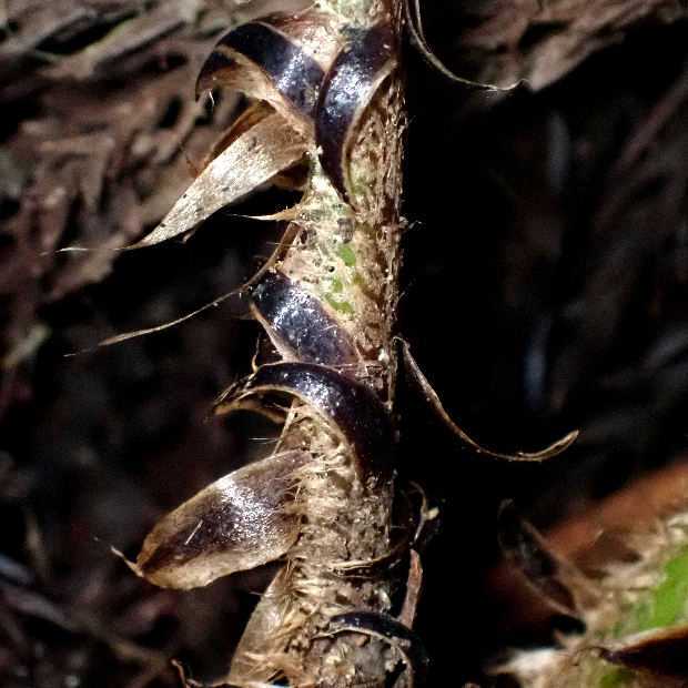 たまに見られるイノデの仲間のシダ。 見出しの秀逸なギャグのとおり、 葉はやや厚みと光沢があるので硬い感じがします。 葉柄に黒い鱗片が混ざるのも特徴です。