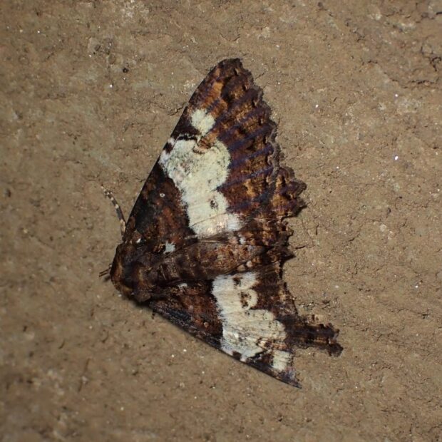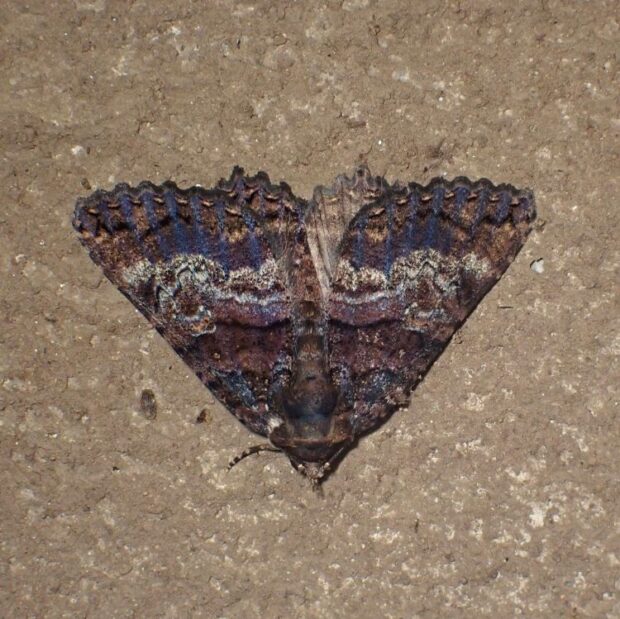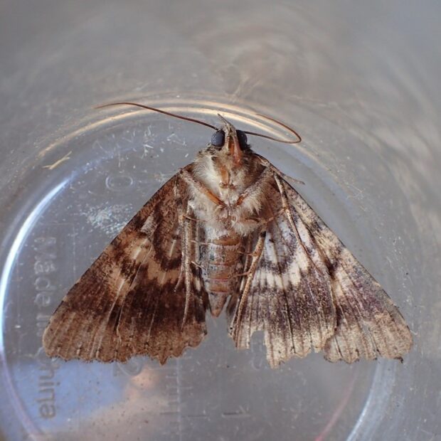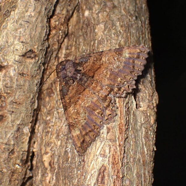 ヤガ科の仲間。 普通に見られ、 はねの色や模様は変異が大きいです。 明かりにやって来ます。