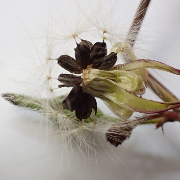 クリーム色の花をさかせます。 花は地味ですが、 若い果実は鳥のくちばしみたいで目立ちます。 熟すと中から綿毛のついた種が出てきます。