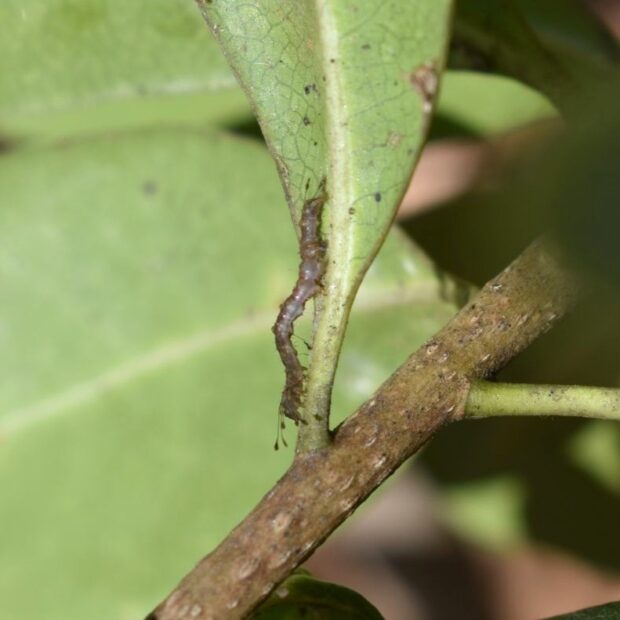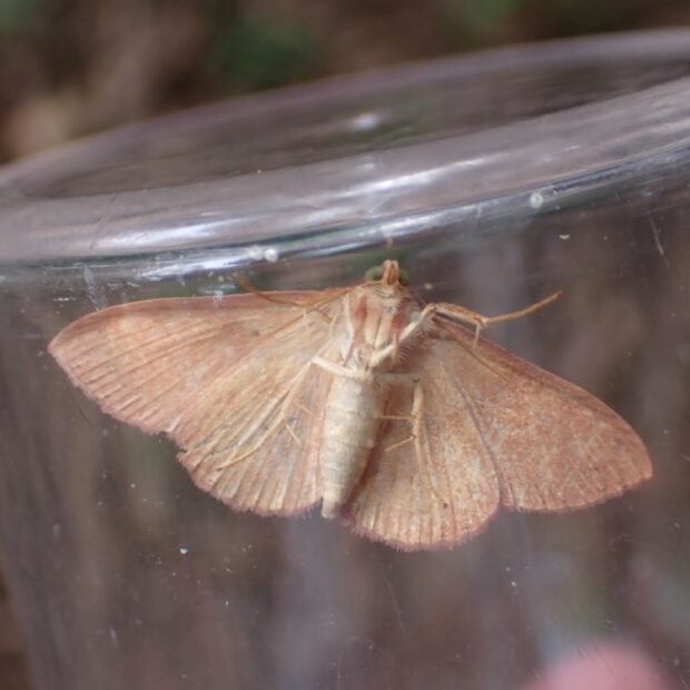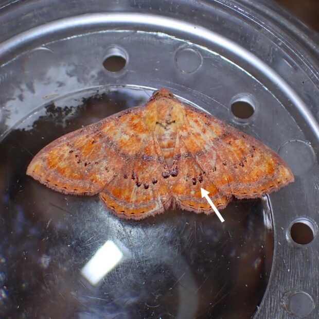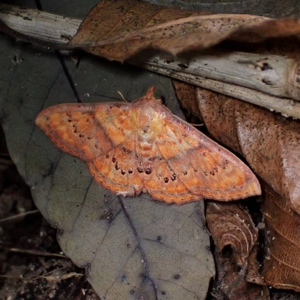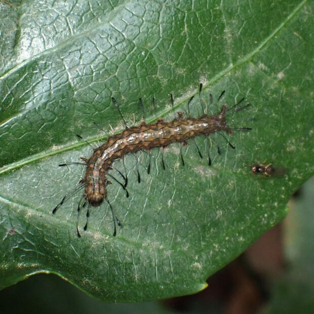 ヤガ科エグリバの仲間。 オレンジ色のはねに横線がある南方系のガ。 幼虫は、 先端がヘラ状になった毛をもつユニークな姿!幼虫で越冬します。