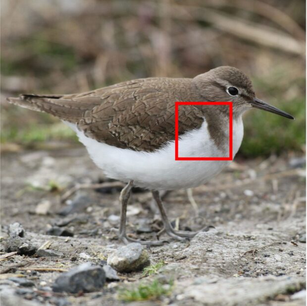 背面は茶色で、 体の下面は白色、 嘴と足はわずかに緑を帯びた黄色です。 体下面の白色が胸で背面側に入り込んでいるため、 ほかの似ているシギ類と区別できます。