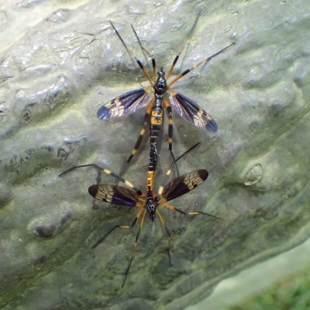 オスの触角がくし状になっている、 黒色とオレンジ色の美しいクシヒゲガガンボ。 ホリカワクシヒゲガガンボに似ていますが、 はねの模様が違います。