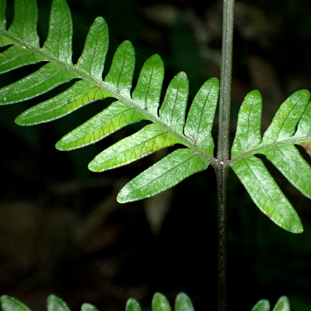 暖かい地域に多いハチジョウシダの仲間のシダ。 この中ではひょろひょろな感じがして、 羽片の基部に柄があることなどが特徴で、 離島を除くと日本で最もよく見られます。
