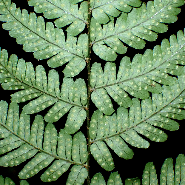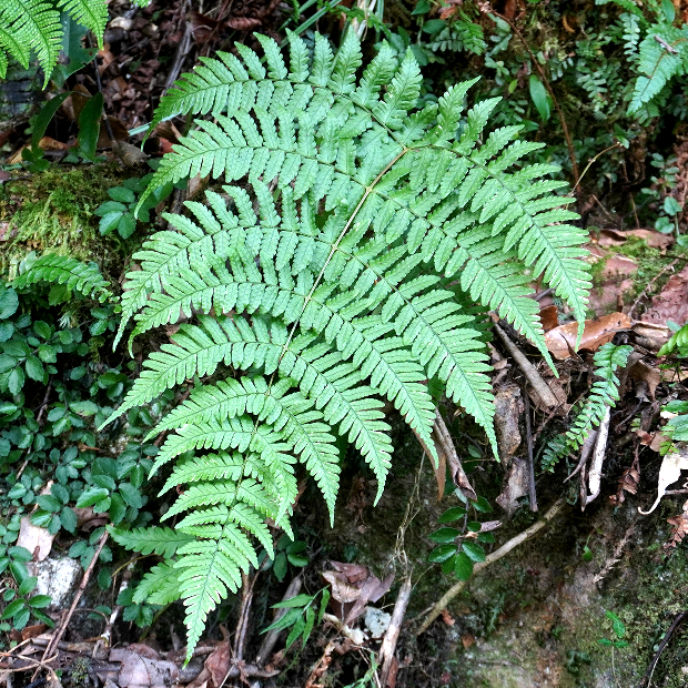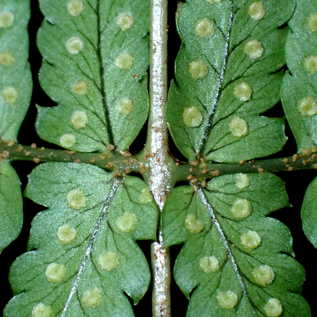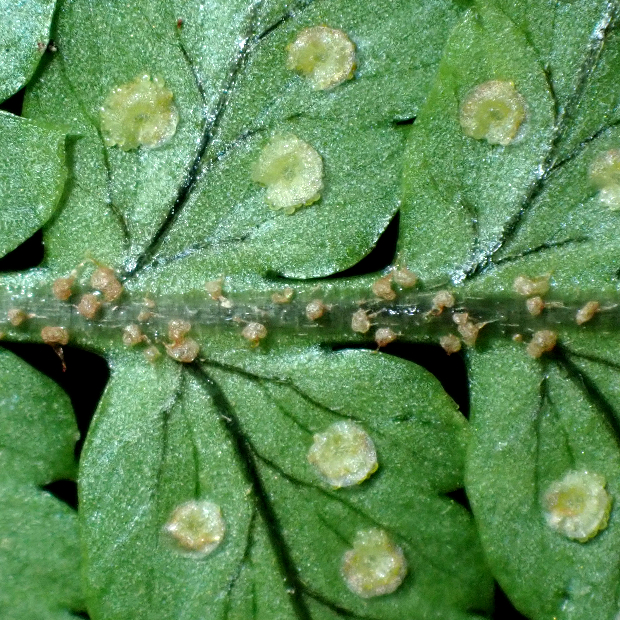 最下羽片の葉軸に接する下向き小羽片は、 となりの小羽片より小さい。