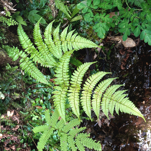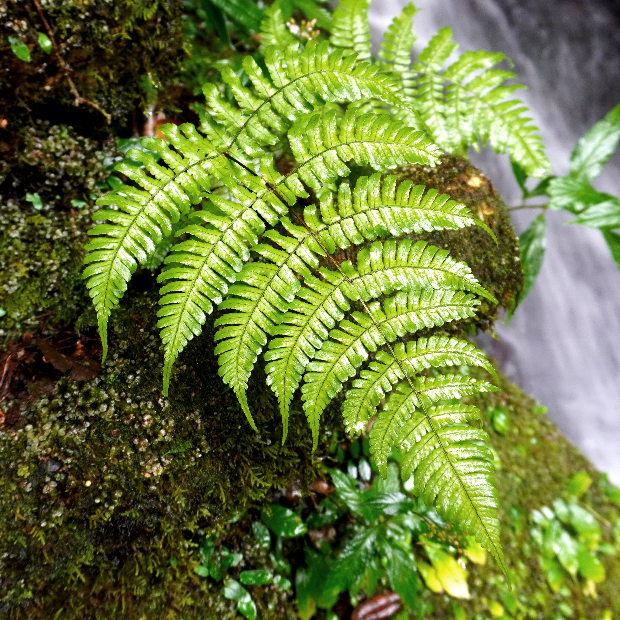 羽片は葉軸に対して直角につき、 基部にはっきりとした柄がない。 よく途中でカーブする。