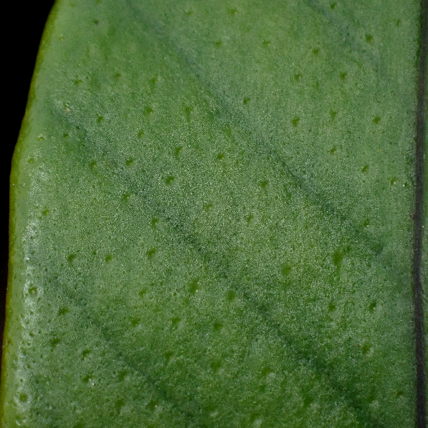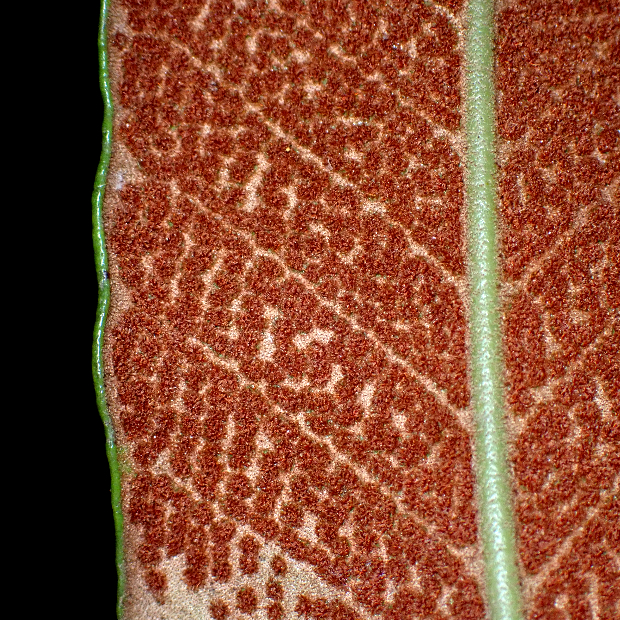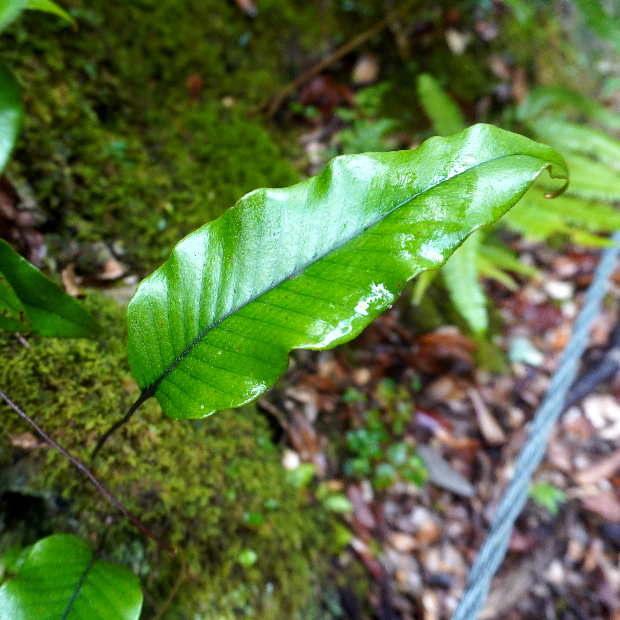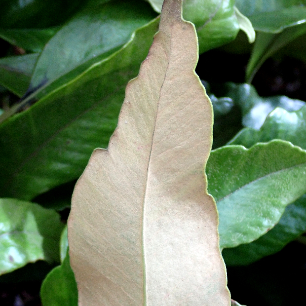 暖かい地域でごく普通に見られる葉っぱ。 こんな姿ですがシダの仲間で、 葉裏に胞子のうをびっしりつけます。 園芸でも人気で、 庭などによく植えられます。