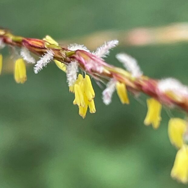 • ススキの花。 1本の花穂に多数の花が咲く。 黄色いのは雄しべの葯で花粉を出している。 白いのは雌しべの柱頭。 風で花粉がとばされて受粉する。