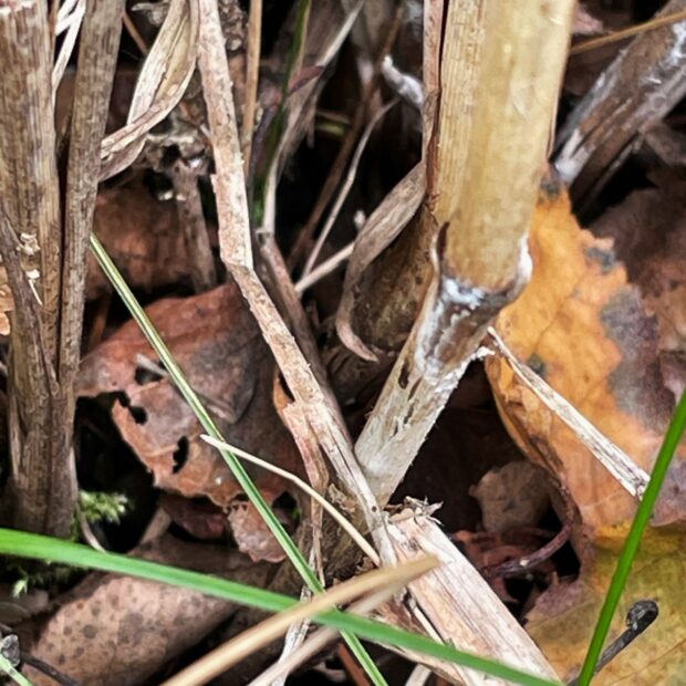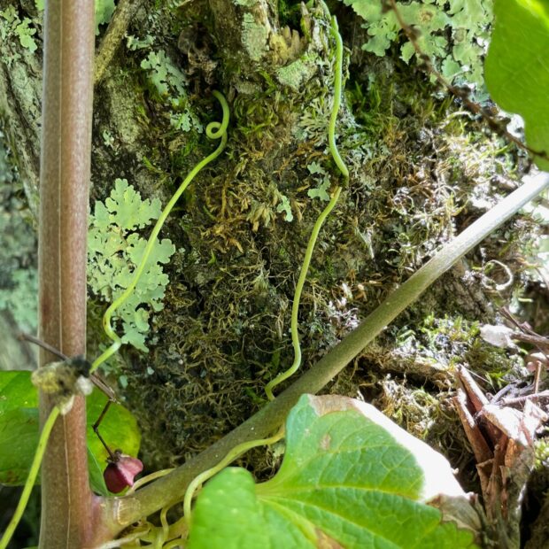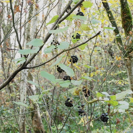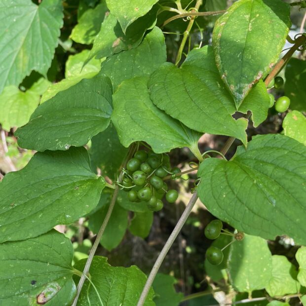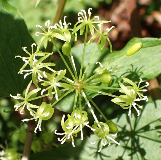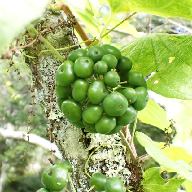 つる性の草です。 若葉がアスパラガスに似た味で美味しいということで「山菜の女王」とも呼ばれます。 初夏にチアガールが持っているポンポンのようなクリーム色の花を咲かせます。 実は晩秋に真っ黒に熟し目立ちます。