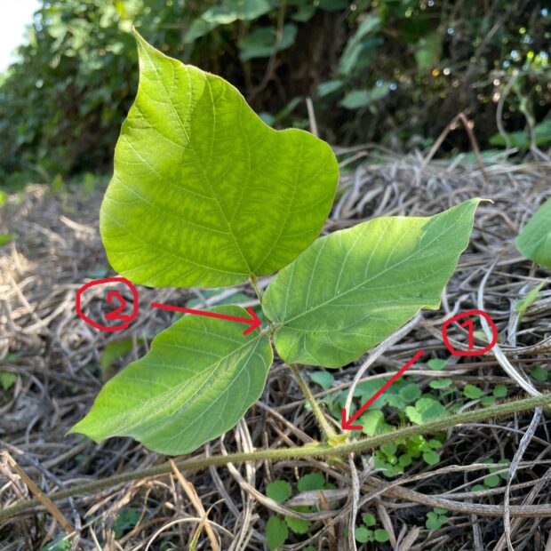 つる性の植物で成長すると茎は10m以上にもなります。 繁殖力旺盛で色んな場所を覆い尽くしています。 大きな3枚セットの葉が特徴です。 真夏に良い香りのピンク色の房状の花を咲かせます。