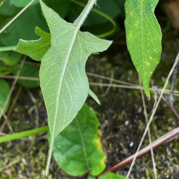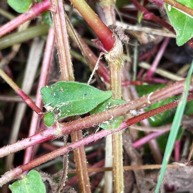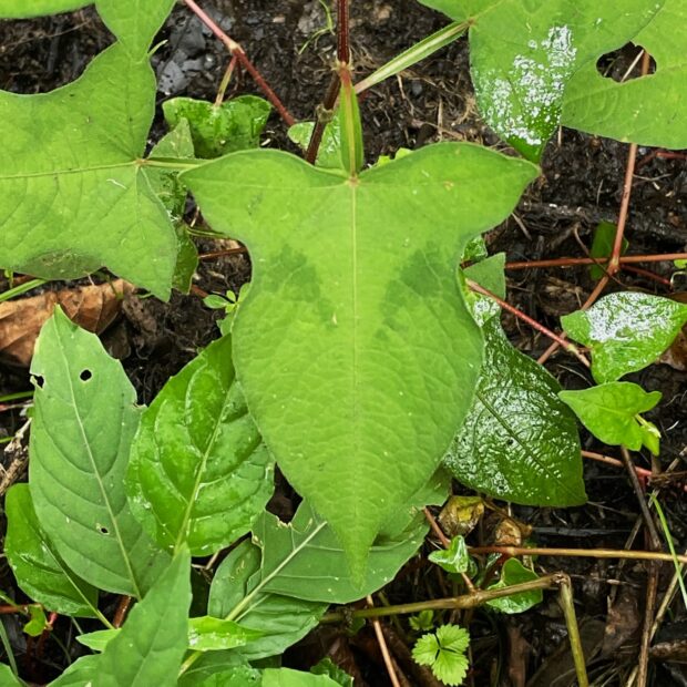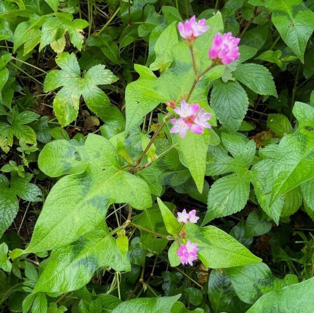 ミゾソバの葉が、 その形と模様で牛の顔に見えることから、 ウシノヒタイ(牛の額)とも呼ばれます。