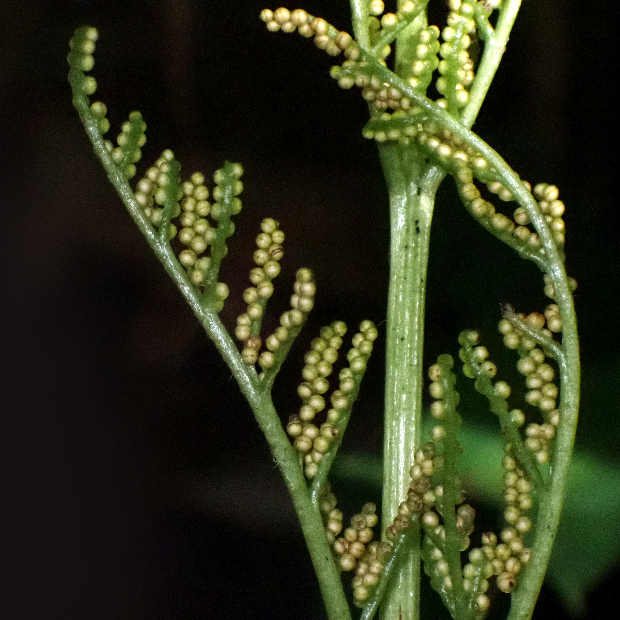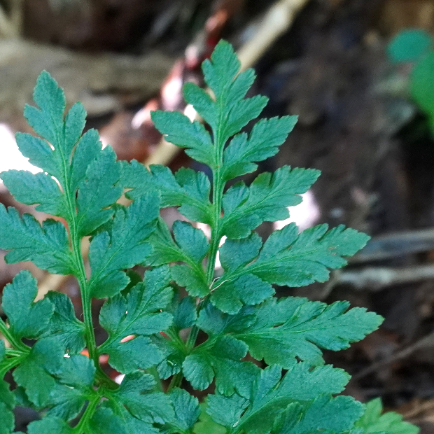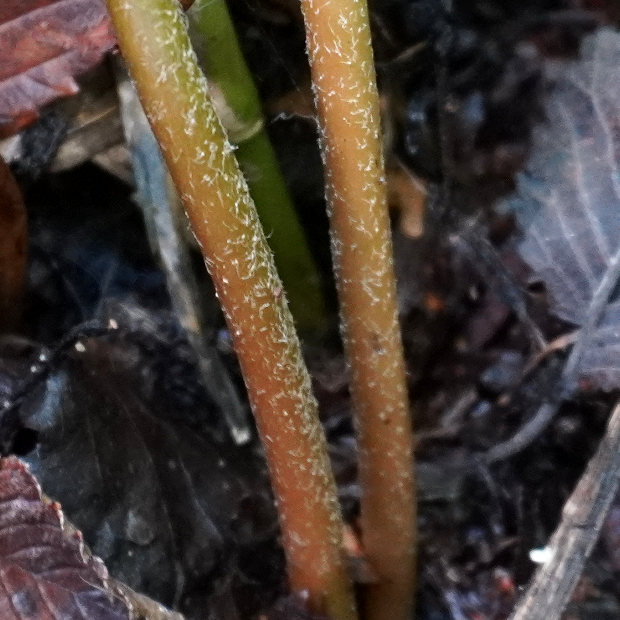 北日本に多い、 寒い季節に葉を広げるシダ。 ハナワラビの仲間は花のように見える胞子を飛ばす葉と、 光合成のみする葉が共通の柄から分かれている姿が独特です。 フユノハナワラビに似ていますが、 柄に毛が多くつきます。