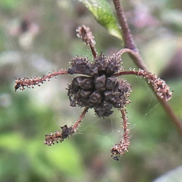 背丈が1m以上になり、 枝分かれした茎の上部にたくさんの花を咲かせます。 花のまわりには、 毛虫のような腺毛が付いていて、 さわるとべたべたします。