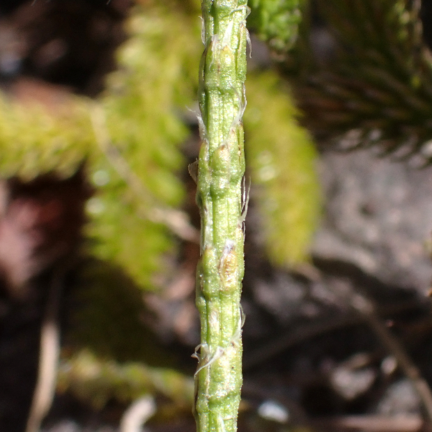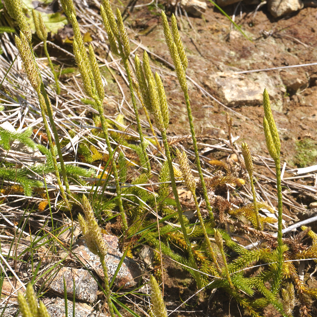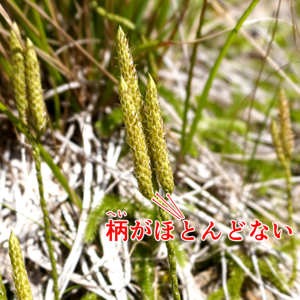 標高のある山地に多いシダ植物で、 低地でも見られることがあります。 ヒカゲノカズラの変種(へんしゅ : 亜種ほどではないけど同種とするには違いがあるもの)とされていて、 胞子のう穂の下に柄がほとんどないことが主な違いです。