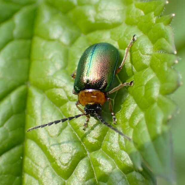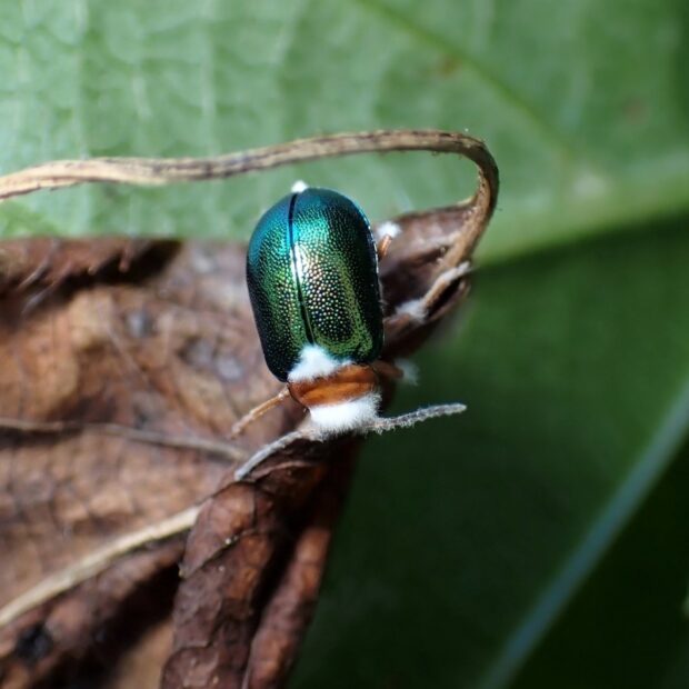 山地で見られる、 金緑色に輝くヒゲナガハムシの仲間。 前胸とあしはオレンジ色で、 上翅(じょうし)は見る角度により、 緑色~赤紫色と、 色が変わります。